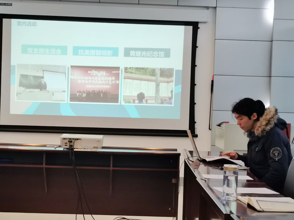 首先进行述职评议的是本科生党支部书记,他的述职报告主要分为工作总结和个人总结两个部分。工作总结主要包括支部成员的事务管理、支部的资料管理和党内的活动,他也在个人总结中也指出尽管由于疫情的影响并未能很好熟悉工作,但他仍旧不断努力希望做到更好。
