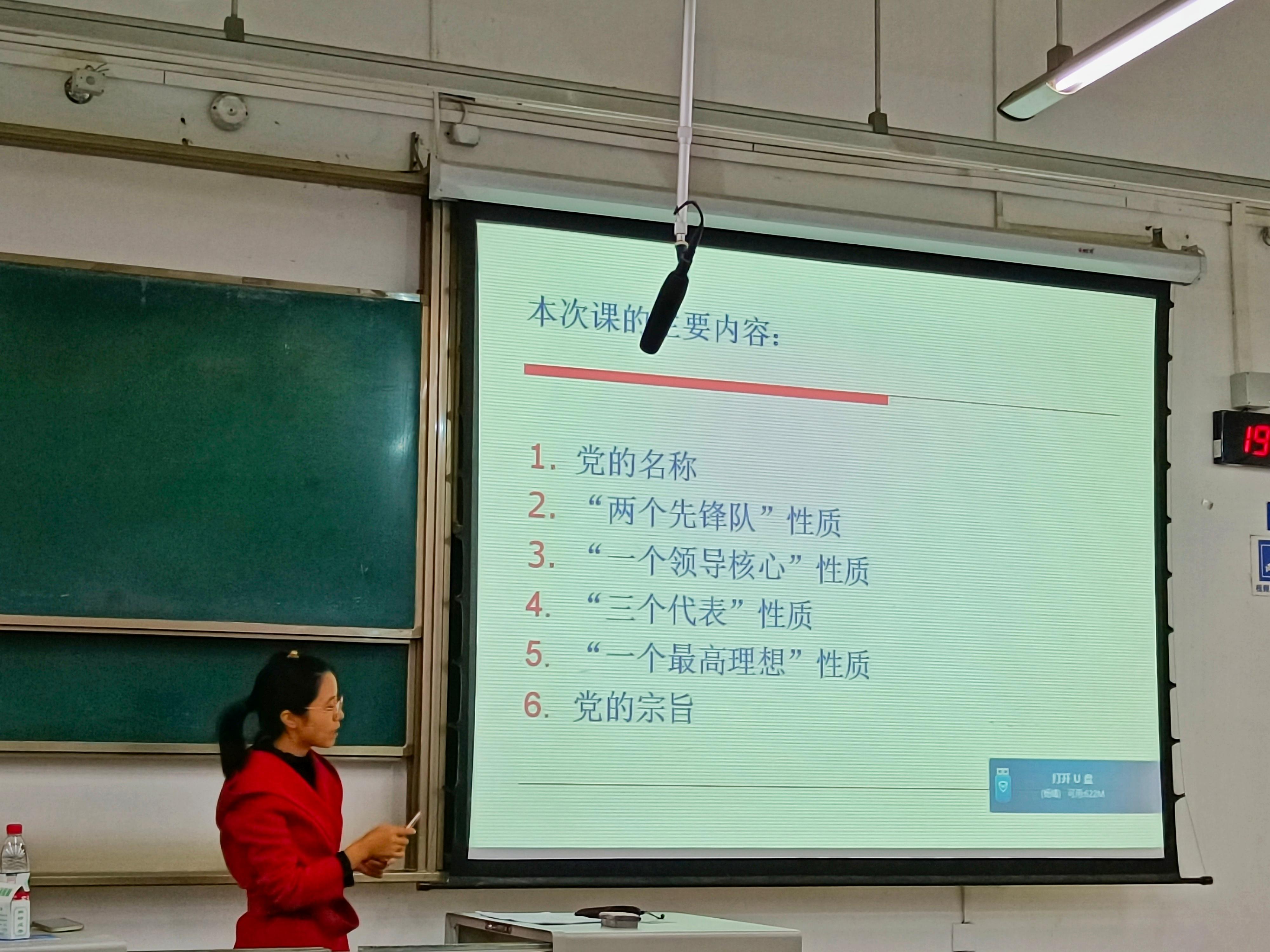 首先,杨婧老师通过回答“为什么叫共产党”以及“为什么叫中国共产党”两个问题、追溯历史事件、提出党的自我定位:第三国际的支部以及对党员国籍的基本要求具体阐述了中国共产党的名称内涵:“共产党”代表我党始终是中国工人阶级的先锋队,“中国”代表了我党始终是中国人民和中华民族的先锋队。接着通过观看理解《关于修改党章的报告》、《列宁选集》、《关于中国共产党的组织章程决议案》等节选片段深入了解不断更新完善的党的性质,并强调中国共产党是中国特色社会主义事业的领导核心。之后杨婧老师展开叙述三个代表的理念并回答我们为什么要坚持中国共产党始终代表中国先进生产力的发展要求、代表中国先进文化的前进方向、代表中国最广大人民的根本利益。最后,杨婧老师强调党的最高理想和最终目标是实现共产主义、中国共产党的宗旨是全心全意为人民服务,同时呼吁我们大家要不断学习,在工作实践中,锻造自己的党性,提升自己的政治觉悟和理论水平,首先在思想上入党,才能够真正肩负起历史和时代赋予的庄严使命。