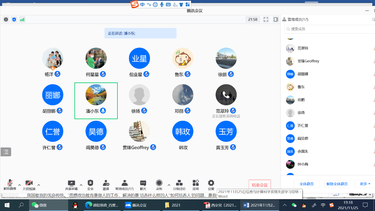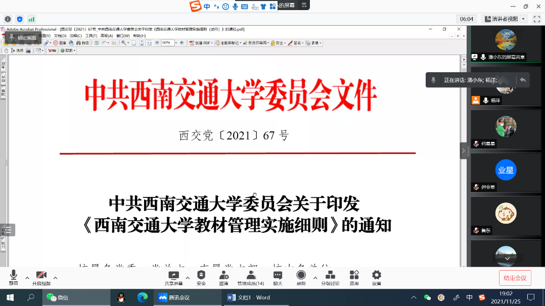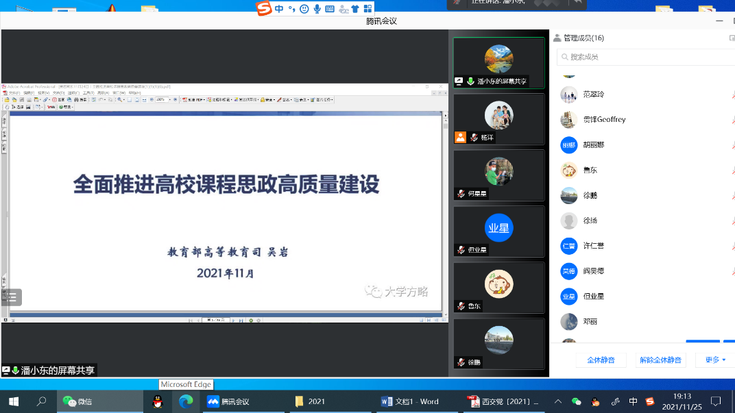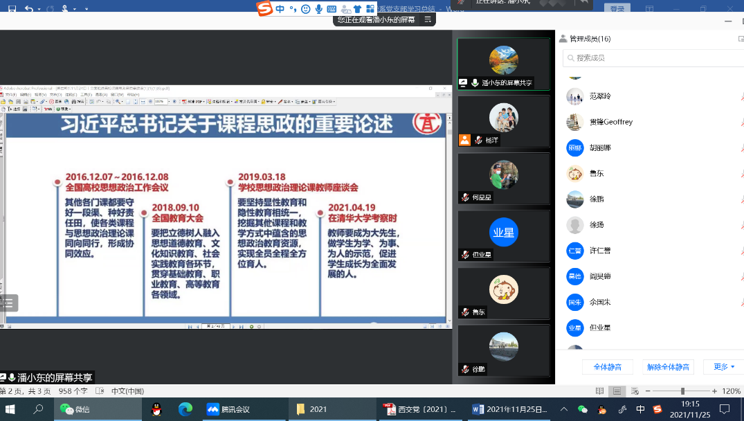 2021年11月25日晚上7:00,kaiyun开云官方网站信息与计算科学系党支部通过腾讯会议(会议 ID:812-645-493)召开支部学习会议。潘小东副院长给老师们解读了[西交党[2021]67号_中共kaiyun开云官方网站委员会《关于印发kaiyun开云官方网站教材管理实施细则试行的通知》]、吴岩司长关于全面推进高校课程思政高质量建设的报告。