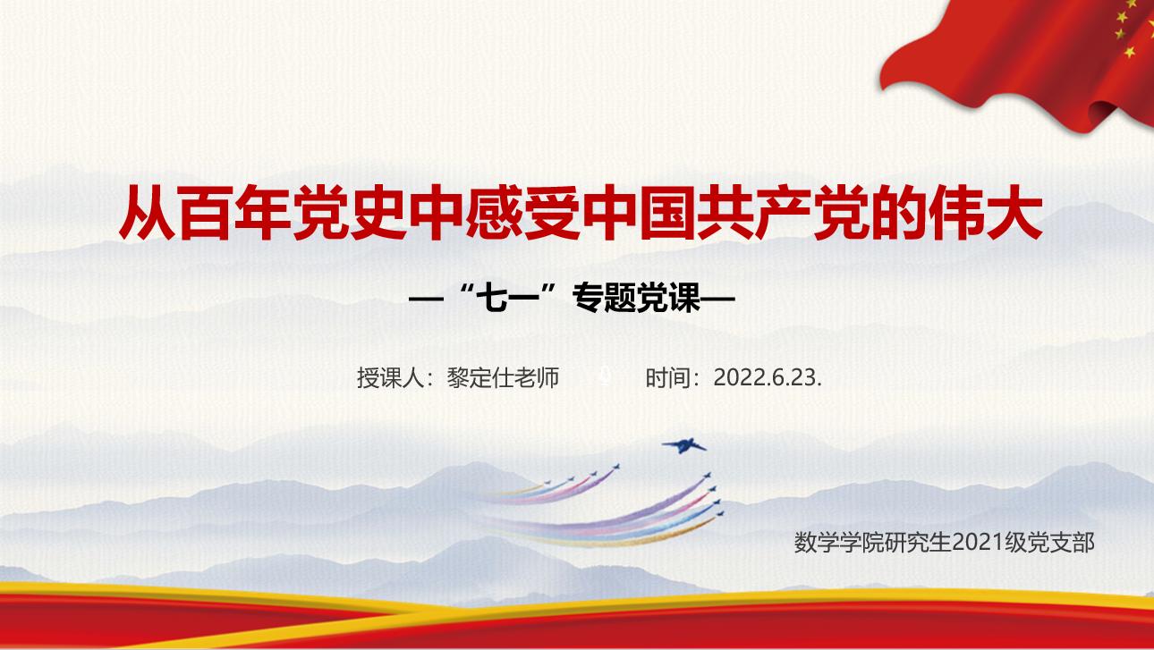 为深入贯彻党的十九届六中全会精神,巩固和拓展党史学习教育成果,加强和改进党员经常性教育,kaiyun开云官方网站研究生2021级党支部于2022年6月23日下午2:30在腾讯会议开展“七一”主题党课活动,特别邀请到了kaiyun开云官方网站院长助理、党委委员黎定仕老师为大家主讲,本次党课的主题是“从百年党史中感受中国共产党的伟大”。