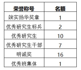 个人荣誉称号含:竢实扬华奖章、优秀研究生标兵、优秀研究生、优秀研究生干部、明诚奖。参评学年课程学习环节有不及格记录者不得申请各类个人荣誉,具体评选条件请见《管理办法》。