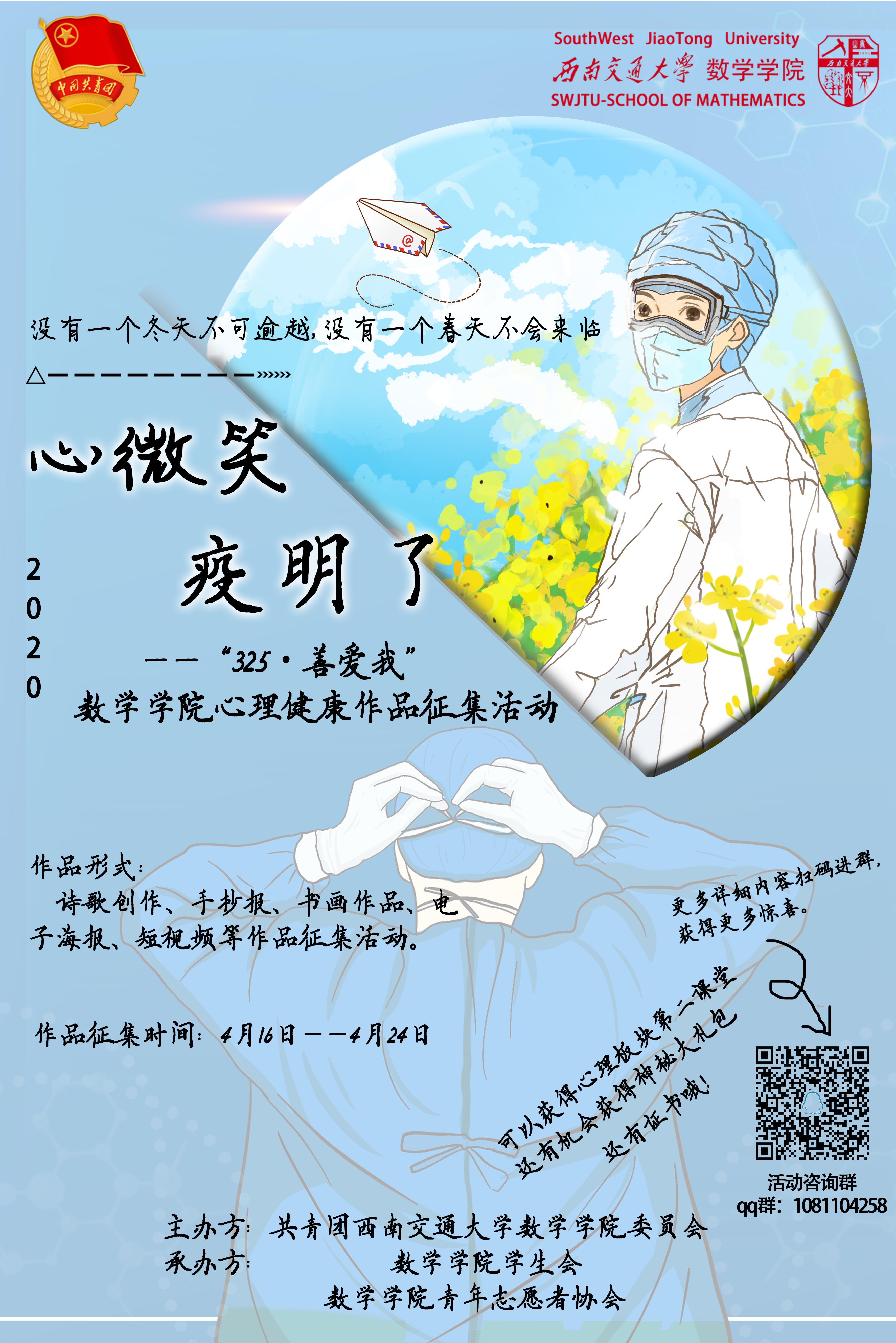 在这个特别的春天,由于新冠疫情的影响,我们无法在交大校园如约相见,只能通过网络进行学习和联络。即便如此,我们依然要保持积极乐观的心态,要相信没有一个冬天不可逾越,没有一个春天不会来临。为了响应学校在疫情期间开展心理健康活动的工作要求,帮助大学生正视心理问题,加强疫情心理、生命和感恩教育,引导大学生善待自我、关爱自我,珍视健康、敬畏生命,营造积极向上的校园心理文化。由kaiyun开云官方网站团委主,院学生会、青协联合承办“心微笑,‘疫’明了”——kaiyun开云官方网站心理健康作品征集活动,在此号召全院学子积极踊跃的参赛,优秀作品将获得院级证书和精美奖品。