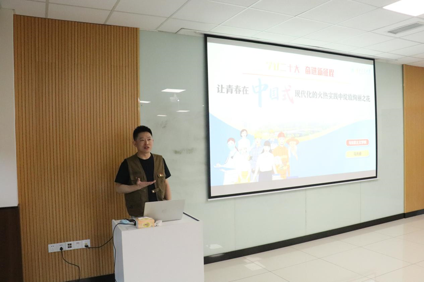 开班仪式结束后,马先睿老师以“让青春在中国式现代化的火热实践中绽放绚丽之花”为题结合党的二十大精神,为参训学员们呈现了精彩的首场讲座。马老师深刻地解读了中国式现代化的内涵、如何走中国式现代化道路。他借用了很多大家喜闻乐见的鲜活案例,向大家阐释了什么是“不忘初心,牢记使命”。最后,马老师回归到青年本身,指出中国青年生逢其时,应勤学善思,保持初心,牢记使命,将自己的努力和目标相结合,用实干、苦干来奋力拼搏,书写自己的未来华章。