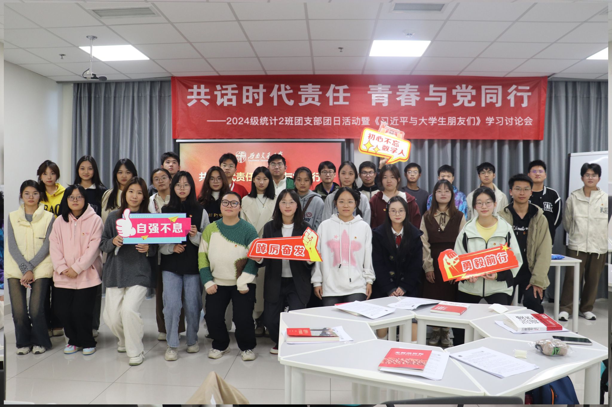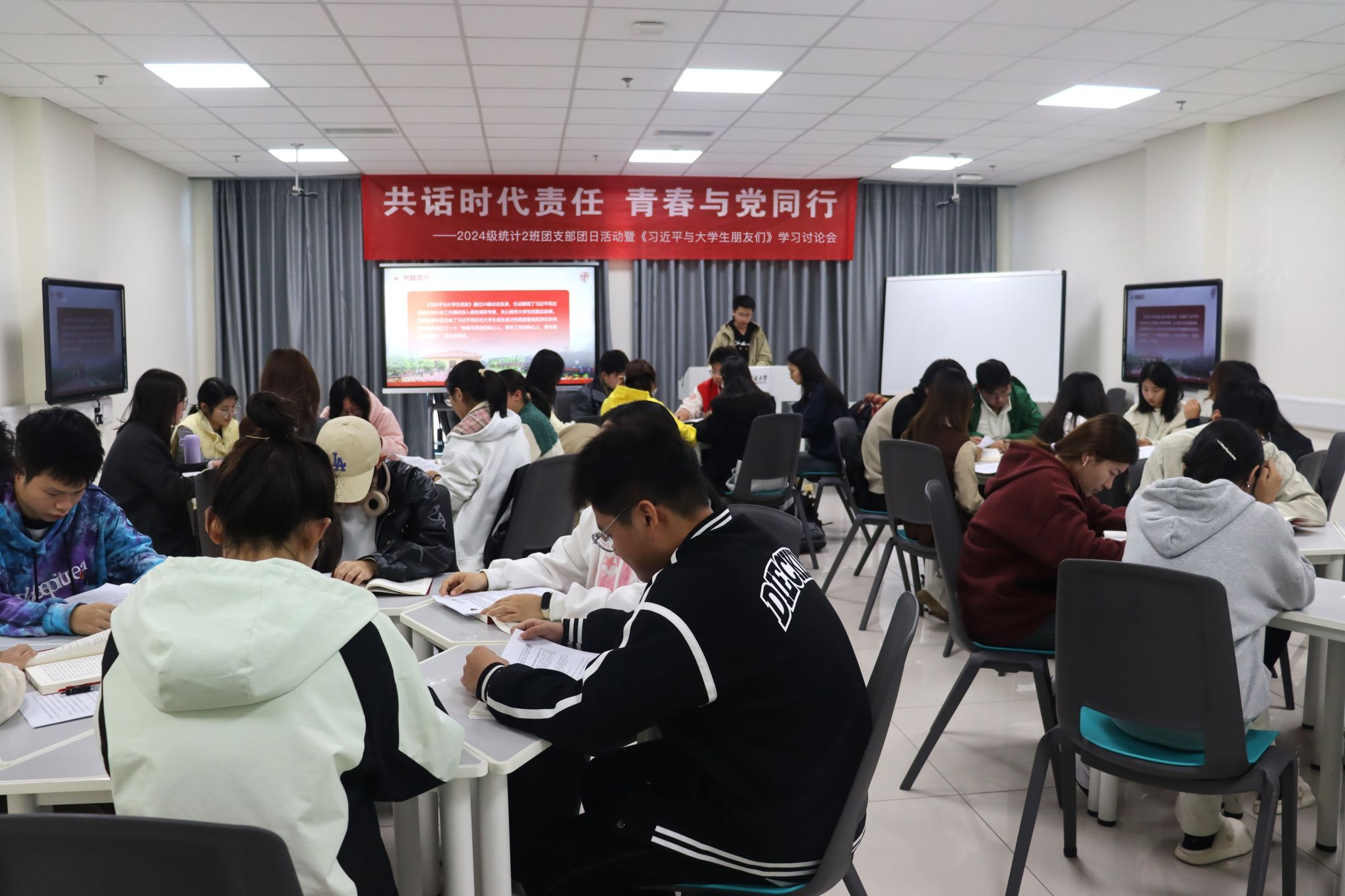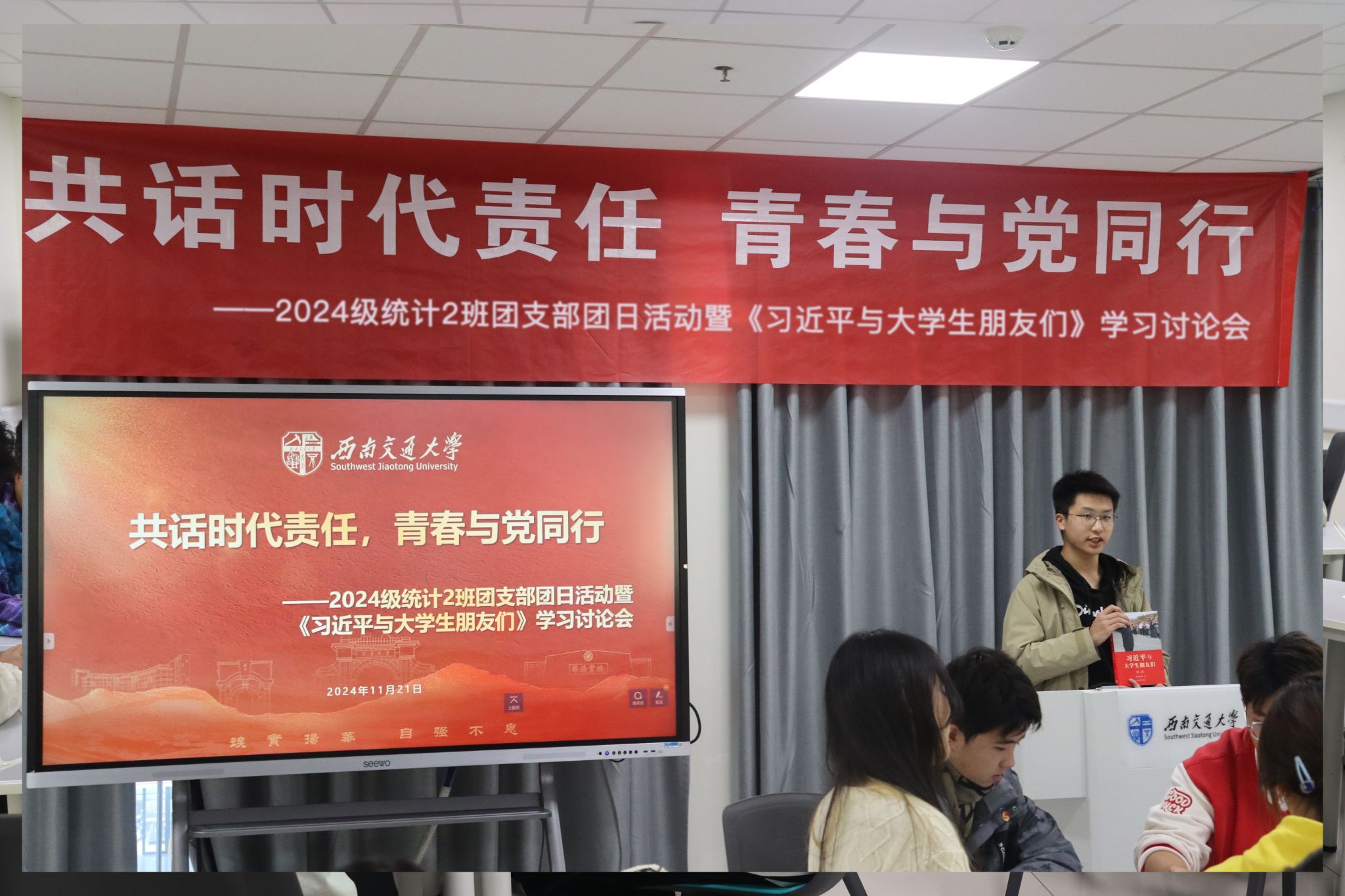 为深入学习贯彻习近平新时代中国特色社会主义思想,2024年11月21日,kaiyun开云官方网站2024级统计2班团支部“共话时代责任,青春与党同行”主题团日活动暨《习近平与大学生朋友们》学习讨论会在X30384顺利举办。本次活动由团建中心詹延同学主持,30余名师生参加。