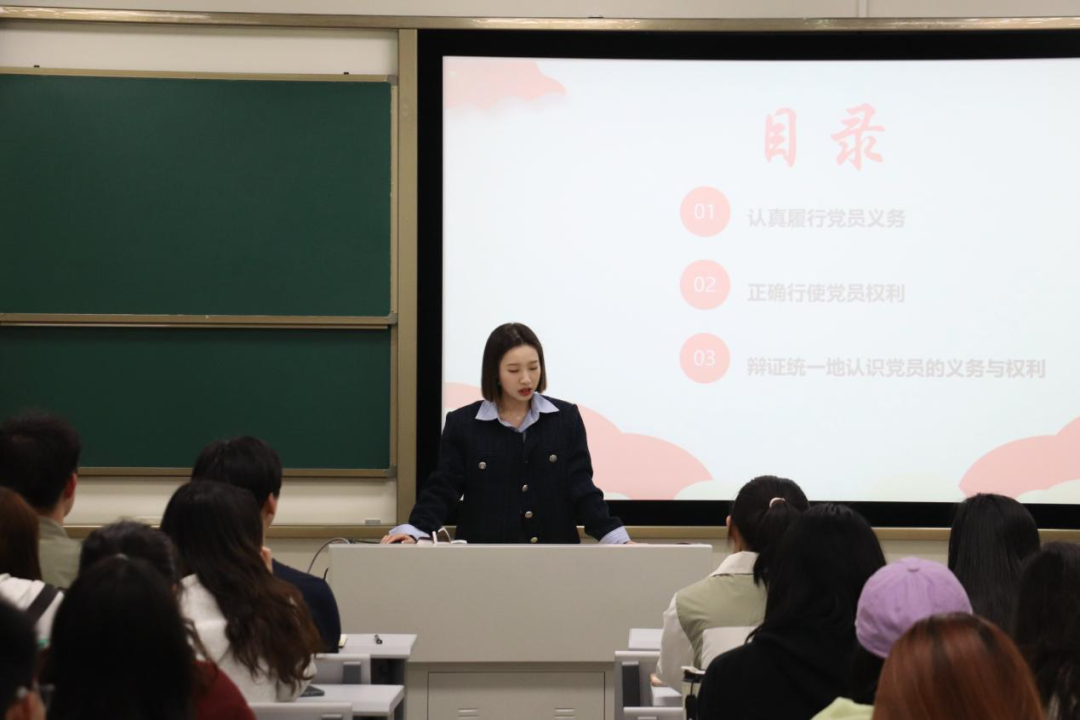 秦思远老师详细介绍了党员的八项权利和八项义务。秦思远老师以党员魏永安一生为民的事迹为例,引导同学们正确行使自己的权利,并强调党员的权利和义务是辩证统一的,二者相互依存、缺一不可。