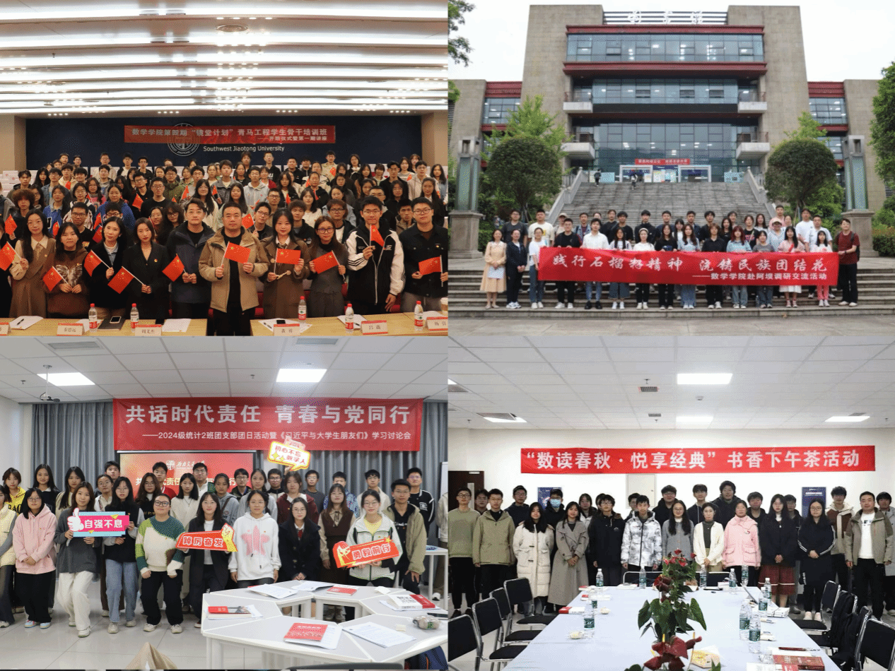 以五育并举为主线,以“思政+”、“学科+”、“交通+”为牵引,以校园文化活动为载体,在服务中长才干。数学建模协会蝉联“十佳学生社团”荣誉称号,“数学+”学科赋能本科生综合素养提升项目入选四川省“我为同学做实事”百佳项目、最受同学欢迎项目。