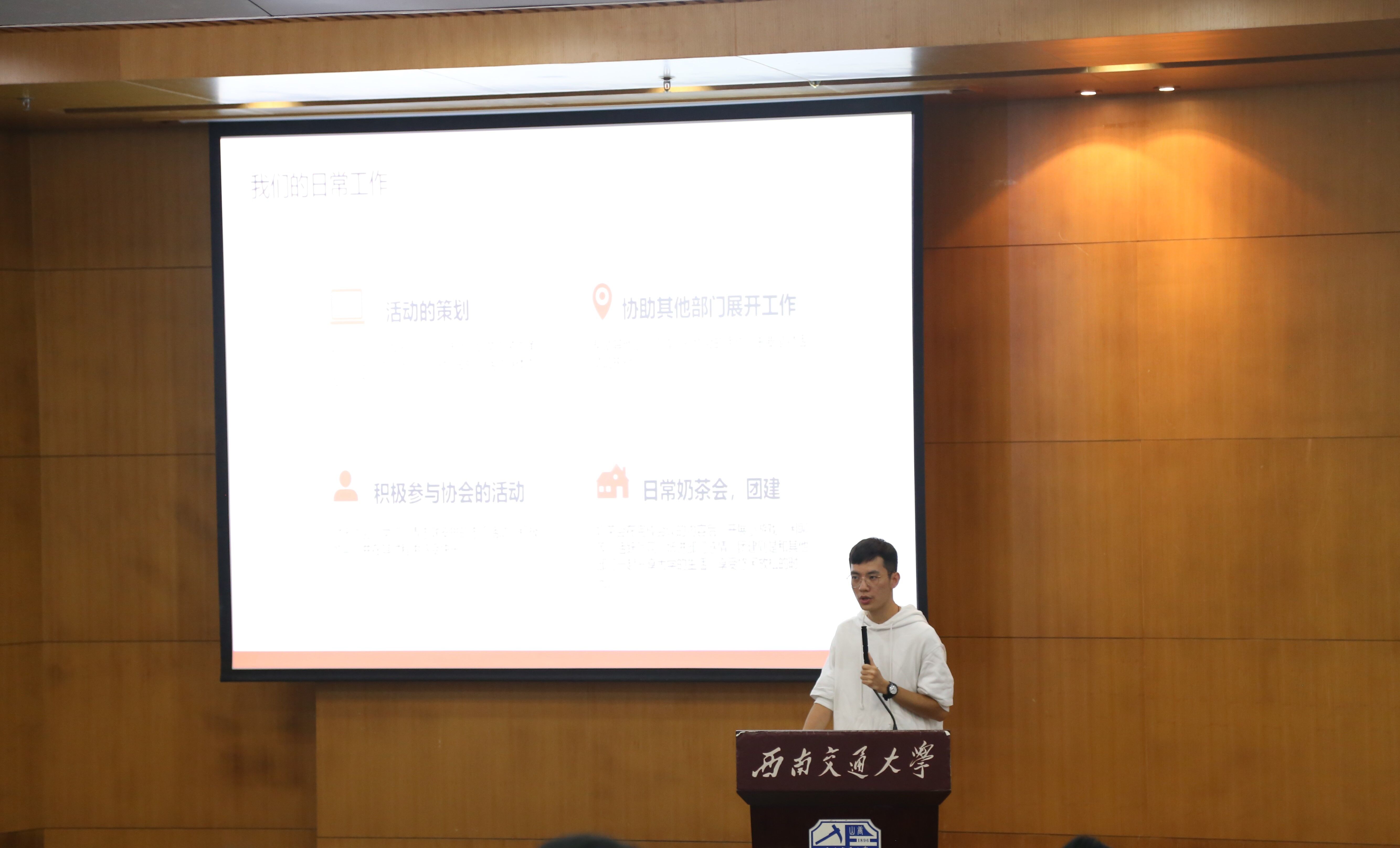kaiyun开云官方网站三大组织采用抽签方式决定了宣讲顺序。首先进行宣讲的是kaiyun开云官方网站学生会。在学生会主席王政慧的经验分享后,学生会宣讲正式拉开帷幕。他们以游戏通关的视频视角向在座同学介绍各部门,各部门部长分别上台宣讲介绍自己部门,新生们对学生会的部门职能有了进一步的了解。