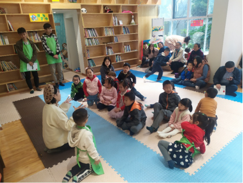 一首诗歌结束,轮值长文远妈妈由此引出本次的感恩主题。上午10点半,正式进入故事环节,故事官上场,其余志愿官负责协助维持场内秩序。小龄组由故事官项乐乐讲述读物《我妈妈》,啾啾妈妈讲述读物《我爱你和世界一样大》和《我不要上幼儿园》。大龄组由轮值长文远妈妈讲述读物《树的礼物》,故事官陈锦讲述读物《遇见你,真好》,带领小朋友们分别从小松鼠和小恐龙的视角感谢自然,感谢朋友。面对家长志愿者和故事官提出的问题,小朋友们积极回答,展现出孩童活泼可爱的一面,他们的回答,时而令人动容,时而令人捧腹大笑,气氛十分活跃。