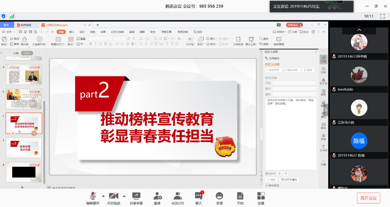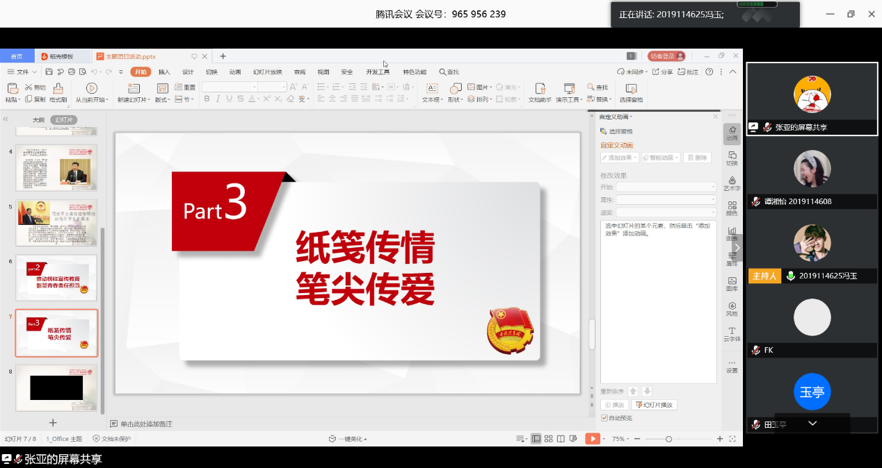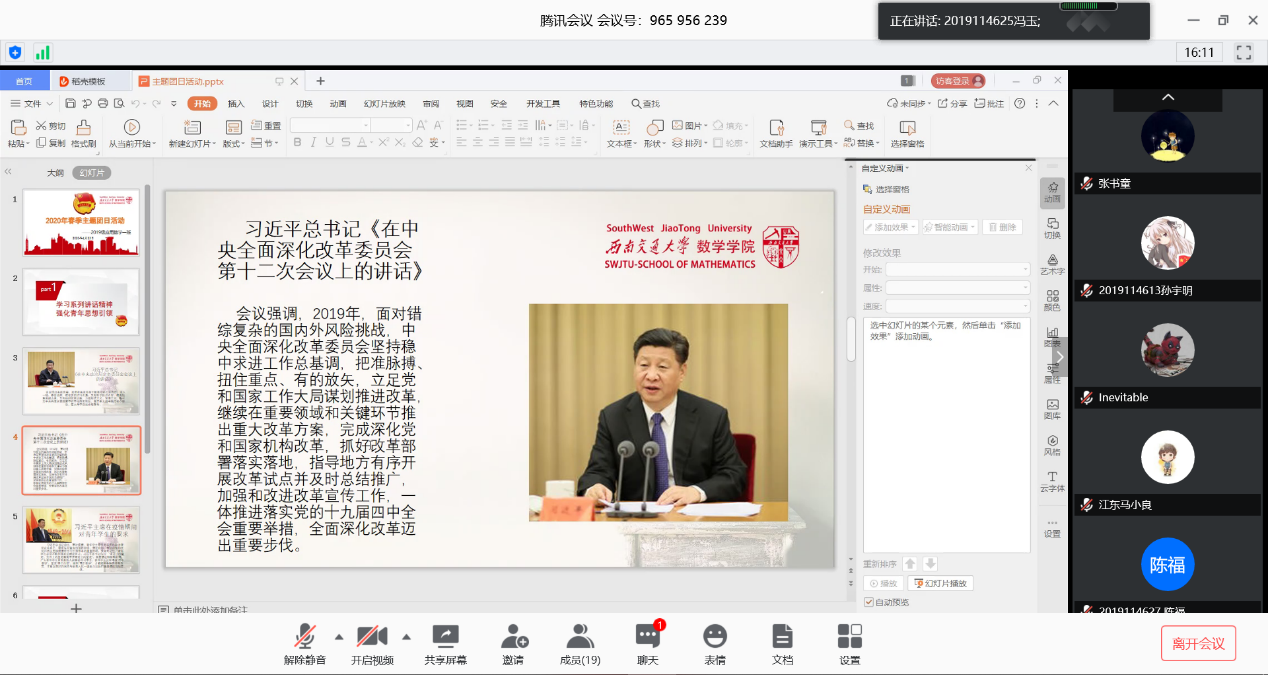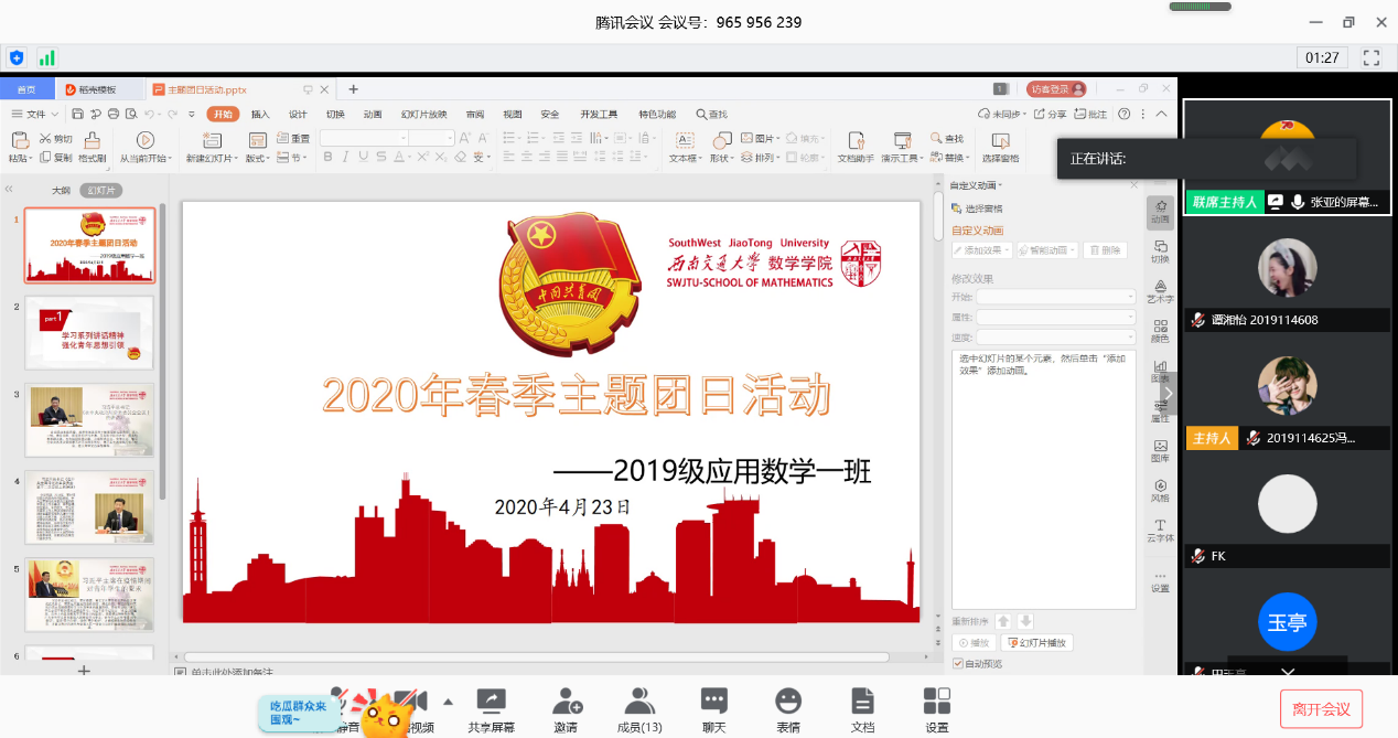 为深入学习贯彻习近平新时代中国特色社会主义思想和党的十九大精神,学习贯彻习近平总书记关于疫情防控工作的重要讲话精神,在防疫特殊时期下响应院团委开展线上活动要求,kaiyun开云官方网站应用数学2019级1班团支部于4月23日下午两点通过腾讯会议成功开展了以“共抗疫情·爱国力行”为主题的线上团日活动,旨在落实防疫举措、强化思想引领、加强主题教育。本次线上团日活动由团支书冯玉主讲,支部全体团员青年积极参加,团委干部懂欢宁、何未到会参加。