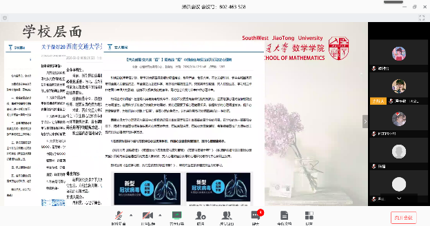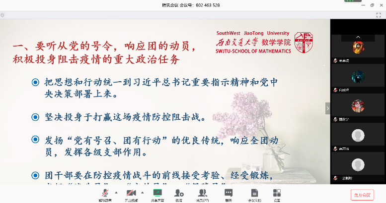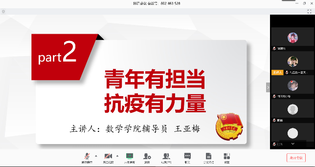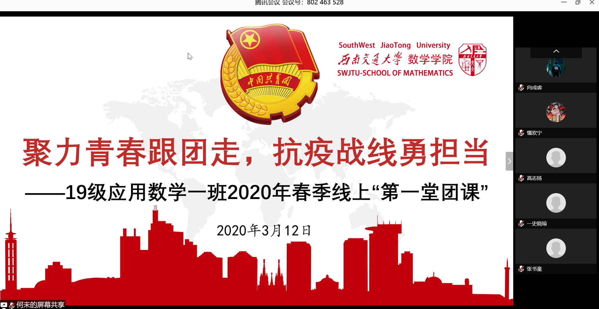 疫情当下,开学延迟。为响应学院团委号召,kaiyun开云官方网站数学与应用数学2019级1班团支部全体团员在团支书冯玉的带领下,参加了以“聚力青春跟团走,抗疫战线勇担当”为主题的2020年春季线上第一堂团课。kaiyun开云官方网站2019级辅导员王亚梅,团委组织部部长林玉受邀参加,并做团课分享。