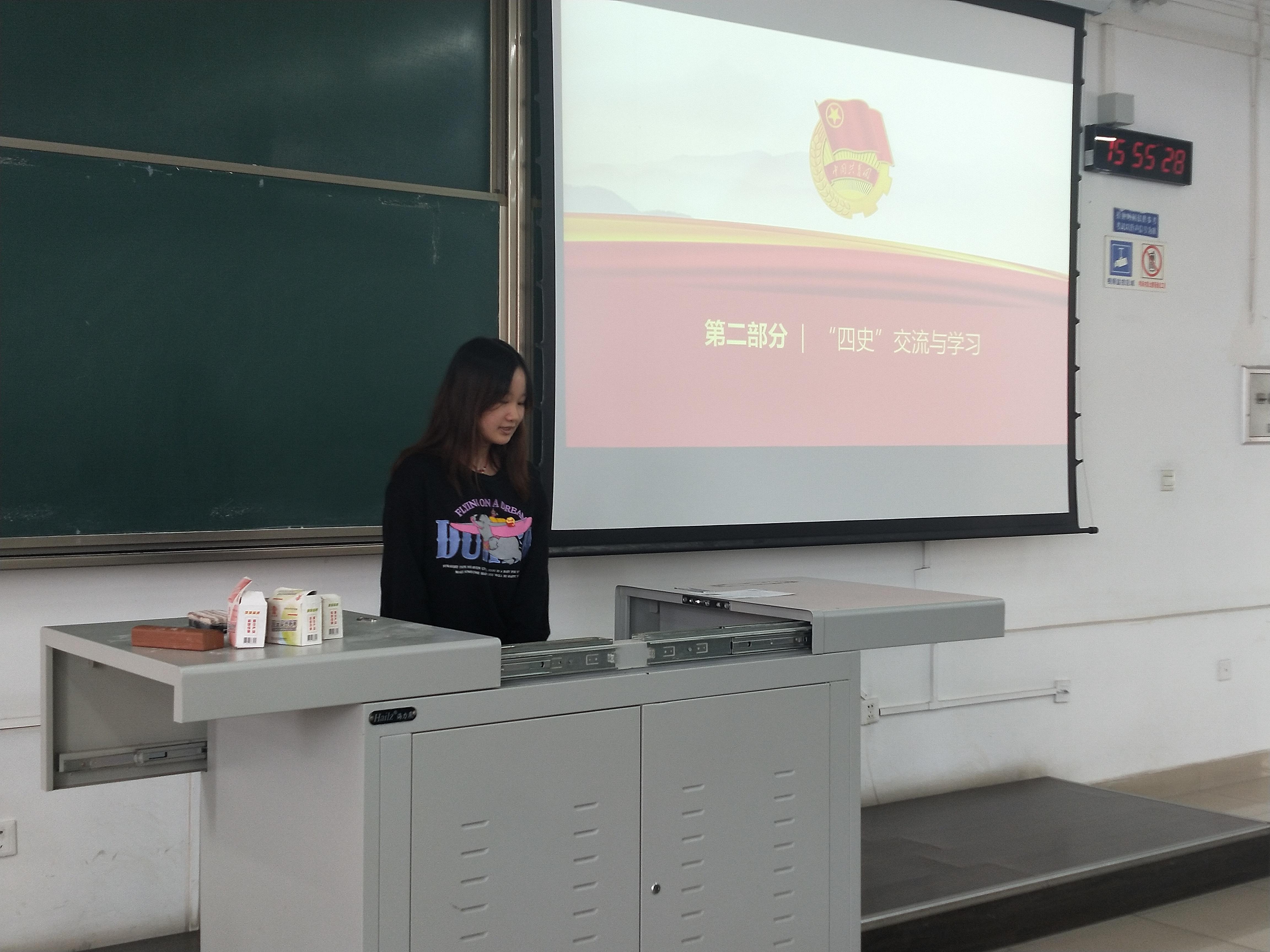 会议第二部分,“四史”交流与学习。首先,由邱灵带领大家学习党史。她关于中国共产党的成立,相关代表人物李大钊、陈望道、陈独秀等,以及标志性事件做出了细致的讲解,并号召所有团员努力提高自己的思想政治觉悟,积极向党组织靠拢。