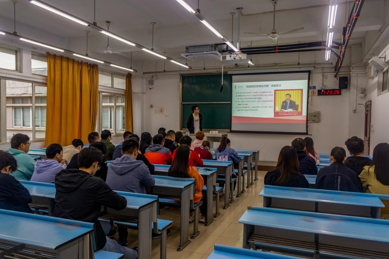 团课开始,为更加贴近了解“成渝双城”,安禾嘉播放了视频《万米高空看成渝》。接着,就“成渝地区双城经济圈”的战略意义、建设基础、建设渊源、安禾嘉做了细致的讲解。他提出,区域发展大格局,地区合作厚基础,为成渝地区双城经济圈建设提供了前所未有的历史发展机遇,成渝地区双城经济圈建设上升为国家战略,更加推动了中国西部两个国家级中心城市珠联璧合。