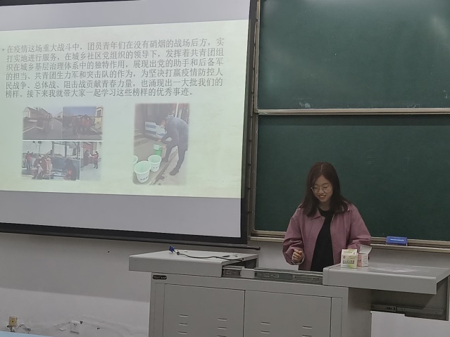 团日活动第二项议程,团支书赵艺琳带领大家学习青年团员的优秀事迹。夜以继日的工作在战疫前线的“青年防疫分队”,帮助工作人员运输支援湖北的物资的青年志愿者,都让我们看到了奋斗在一线的青年的风采与担当,我们应以他们为榜样,打好疫情防控阻击战。