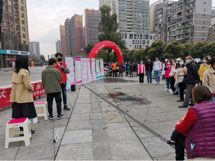 上午8时30分,天空飘着小雨,空气透着一丝微凉,活动参与成员到达犀浦润扬双铁广场,进行活动准备,并分发社区防诈骗和妇女节相关宣传单。