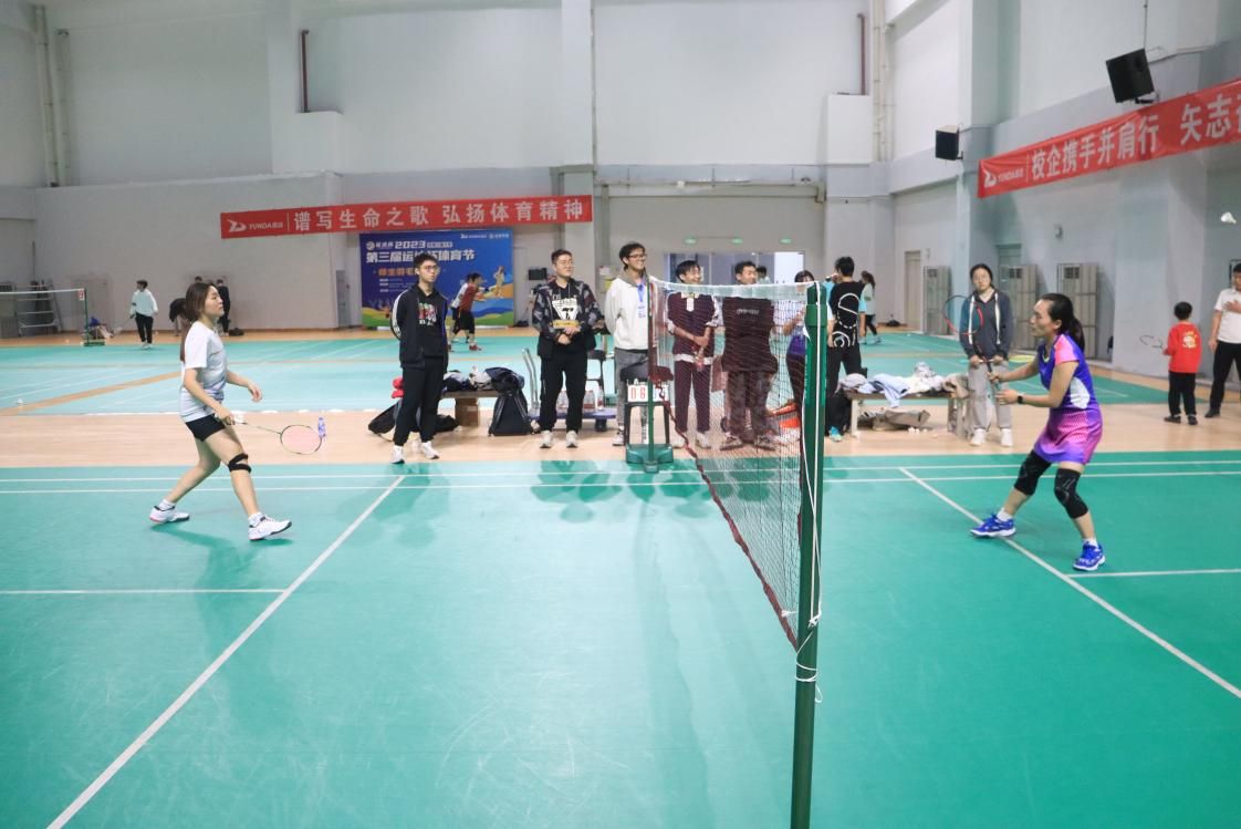 在充分的热身后,比赛正式开始。四支参赛队伍两两对抗,学院教职工代表队展现了精湛的羽毛球技术与独有的默契,学生代表队展现出少年蓬勃向上的拼劲与青春的活力。比赛如火如荼地进行着,观赛的老师、同学为之呐喊加油。