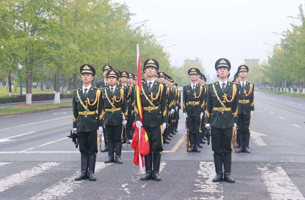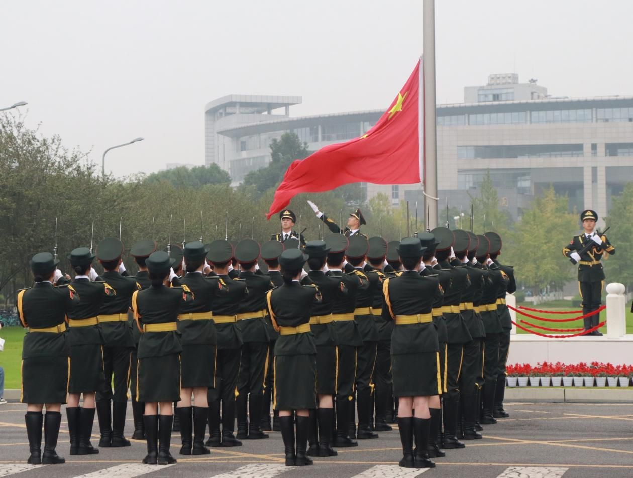 国旗护卫队迈着整齐的步伐将五星红旗护送至升旗台,全场师生肃穆站立,行注目礼,国旗在《义勇军进行曲》旋律中缓缓上升。全场师生合唱《我爱你中国》《我和我的祖国》,用歌声为祖国生日送上祝福。