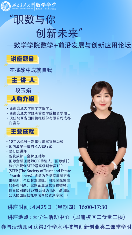 4月25日,第二期“职数与你,创新未来”论坛在大学生活动中心顺利举行。此次论坛的主题为“在挑战中成就自我”,主讲人为kaiyun开云官方网站1999级校友、陕西省国际信托股份有限公司成都财富总段玉娟女士。kaiyun开云官方网站党委副书记黄祥主持本次论坛活动。