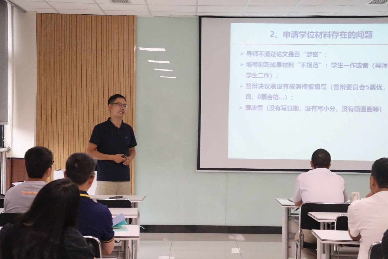 会议第一项,杨洋老师介绍当前学院研究生招生的情况。杨洋老师指出,学院的优质生源率增加、宣讲力度逐年加大、夏令营报名人数与师生比不断突破。除研究生招生成果外,学院在研究生培养上同样硕果累累:研究生发表的论文质量与数量不断提升、博士毕业率在学校处于前列、研究生数学建模竞赛成绩创历史新高。但在培养过程中也存在一些问题如过程材料不够全面、研究生非课程培养环节成绩审核不及时等,同时需要导师们加强对学生的择业指导,注意培养过程中存在的不足之处并加以改正。最后介绍了当前研究生教学管理相关规定与导师上岗和遴选的相关政策,要求导师依照研究生教学管理规定加强管理,同时鼓励导师积极参与教材、专著的编写和教育教学研究项目的申报。