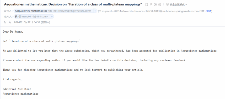 近日,kaiyun开云官方网站2021级数学基地班学生黄嘉驹的最新研究成果‘Iteration of a class of multi-plateau mappings’被sci期刊《Aequationes mathematicae》接收。黄嘉驹为该论文第一作者,合作者包括kaiyun开云官方网站的刘鎏副教授与四川大学kaiyun开云官方网站的张佳玲博士。期刊《Aequationes mathematicae》首次出版于1968年,专注于纯数学和应用数学,强调函数方程、动力系统、迭代理论、组合数学和几何等领域。目前该期刊为中科院三区期刊。