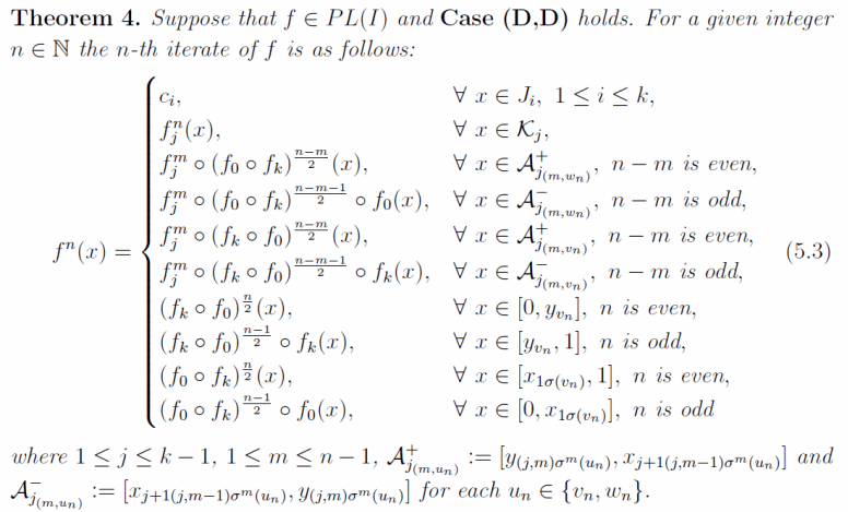 迭代的非线性特性在研究中带来了巨大挑战,并导致了许多复杂行为,如分岔、混沌和从迭代中产生的分形。已知流的一维时间映射定义了一个离散动力系统,而一个离散动力系统是否能够嵌入连续动力系统则取决于其映射的迭代。在一维情况下,许多研究集中在具有有限个非单调点的非单调映射的整数或分数次迭代上。然而,对于具有无限个非单调点的情况,相关研究结果相对较少。本论文主要针对无限个非单调点的情况,研究了一类具有有限多平台的Markov平台映射,其平台均过对角线。首先通过单调性将此类平台映射分为四种情形,然后参考符号动力系统将平台端点迭代的原像点用序列与之对应,再分别给出了每种情形下所产的所有序列并将它们所对应的原像点进行排序,由此即可将区间分割并通研究在这些子区间的迭代给出了每种情形的任意整数次迭代的具体表达式。下图为文中DD情形下的具体迭代表达式: