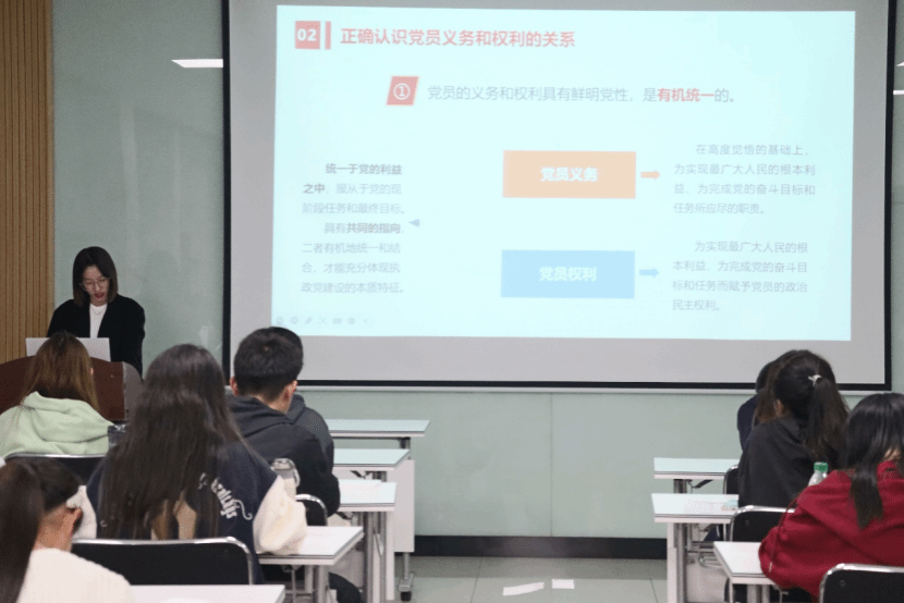青年讲师团成员秦思远老师为同学们详细介绍了党员的八项义务与八项基本权利。秦思远老师指出,党员的义务和权力是相互依存、相互促进的,二者缺一不可。她强调,党员应认真履行义务,正确行使权力,并正确认识党员的义务和权力的辩证关系。