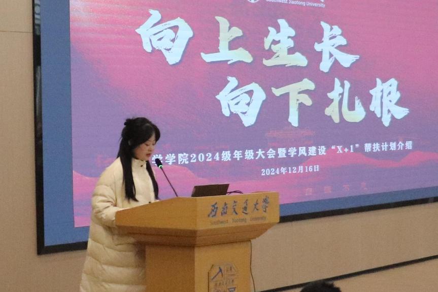 黄祥副书记为2024级本科生介绍学风建设“X+1”帮扶计划实施规划。本学年的帮扶计划选配优秀学长72名,成立37个帮扶小组(含留学生小组),帮助新生适应学习,养成良好学习习惯,明确未来发展规划,形成积极进取态度,提供学业指导、竞赛科创、社会实践、生涯规划、谈心交流等多方面内容,实现了学风建设“X+1”帮扶计划新生全覆盖。