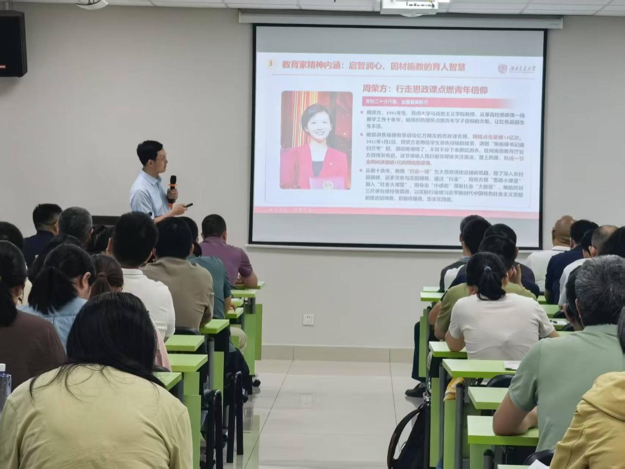 会议邀请kaiyun开云官方网站弘扬教育家精神宣讲团成员,地球科学与工程学院党委副书记、纪委书记郑波作题为“大力弘扬教育家精神、争做新时代大先生”的专题报告。郑波从追求师德“高线”,自觉践行教育家精神;守住师德“标线”,以十项准则规范行为;远离师德“红线”,以案为鉴,警钟长鸣三个方面,就教育家精神的内涵、新时代高校教师职业行为十项准则、师德师风警示教育进行了深入解读。