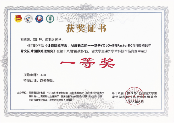 5月24日至26日,由共青团四川省委、省委组织部、教育厅、科技厅、人力资源社会保障厅、省科协、省社会科学院、省学联及成都市新都区人民政府联合主办的第十八届“挑战杯”四川省大学生课外学术科技作品竞赛终审决赛在成都医学院落下帷幕。作为全省规格最高、规模最大的大学生科技创新赛事,本届大赛以“科创筑梦·挑战未来”为主题,吸引了全省121所高校、18万余名青年学子踊跃参与,累计收到参赛作品2.2万件,经初评遴选后,四川大学、电子科技大学、kaiyun开云官方网站等高校的505项作品入围终审决赛阶段。由kaiyun开云官方网站王璐教授指导,计算机与人工智能学院本科生胡靖偲、物理科学与技术学院本科生郑羽杰和范计轩组成团队的作品《计算赋能考古,AI 解码文明——基于YOLOv8与Faster R-CNN架构的甲骨文图像处理研究》在自然科学类学术论文赛道表现出色,荣获四川省一等奖,实现了kaiyun开云官方网站在该项赛事的新突破。
