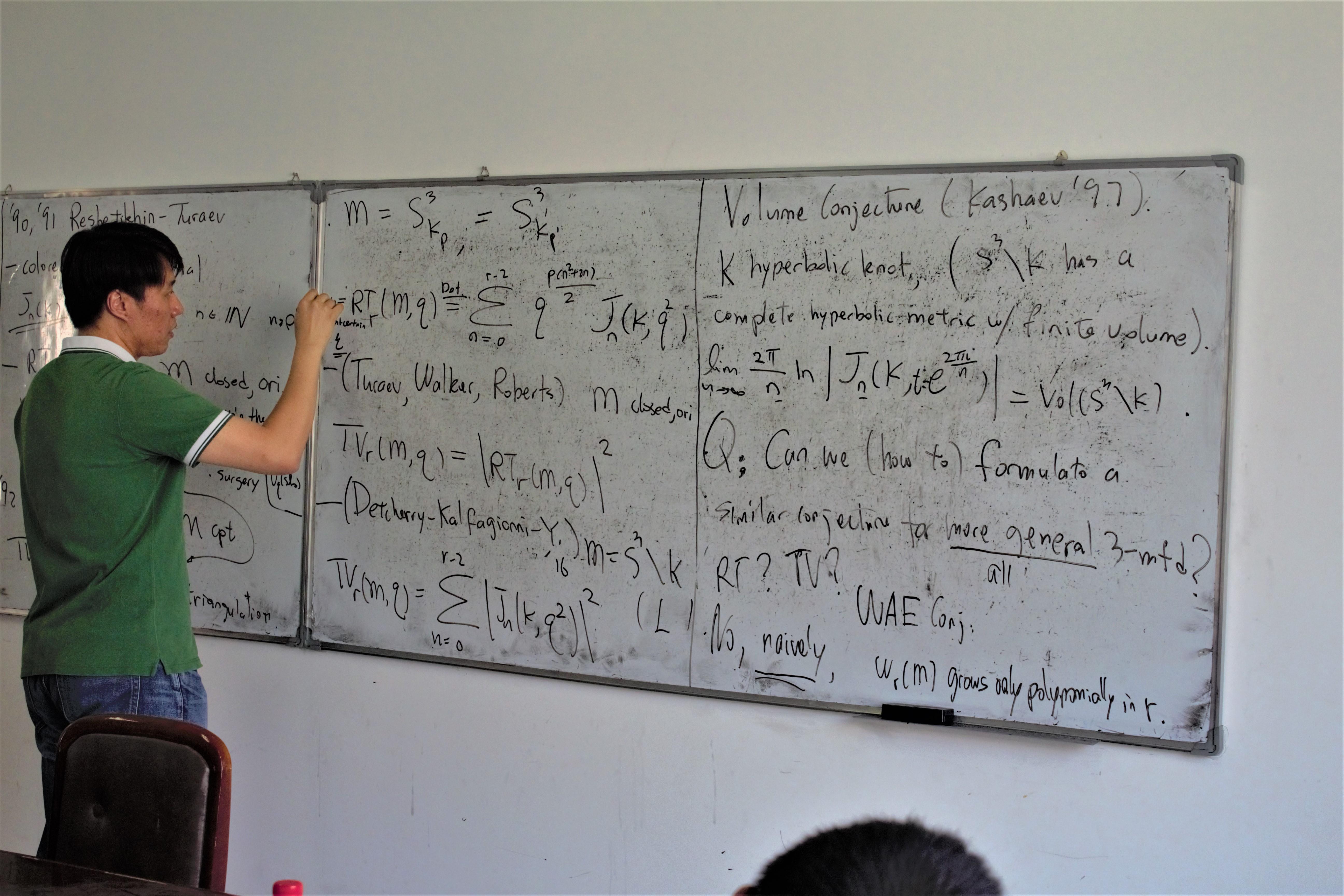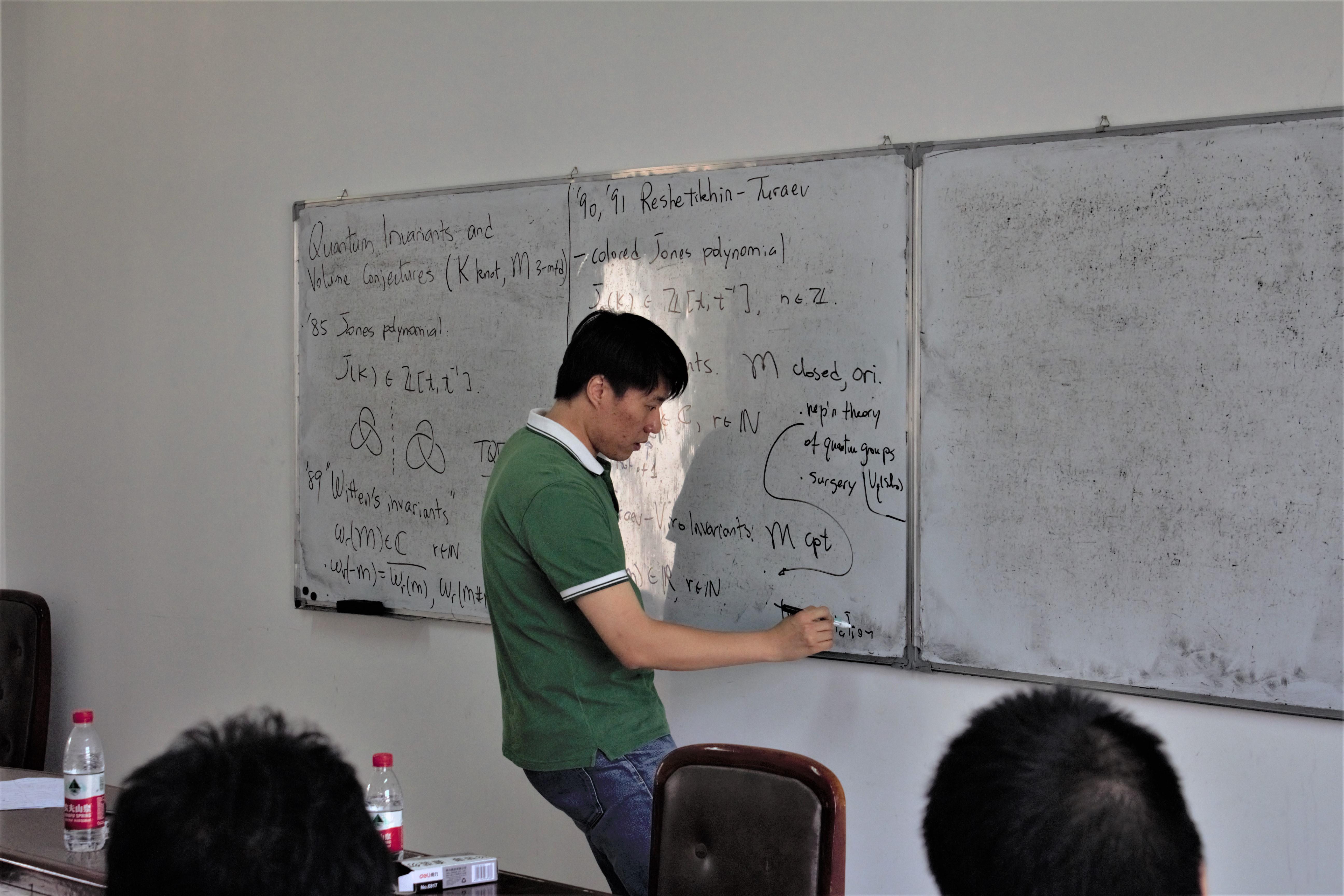 2018年6月4日下午3点,杨田老师在X2415做了题为“近日关于Turaev-Viroin不变量的相关体积猜想(Some recent progress on volume conjucture for the Turaev-Viroin variants)”的学术报告,来自四川大学和开云kaiyun开云官方网站的老师参加了本次报告会。报告主要介绍了量子拓扑当中的几个量子不变量,以及杨田老师通过更换单位根和利用理想三角剖分的方法所做的相关工作。
