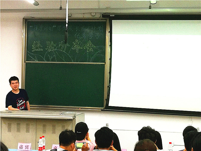 最后分享自身经验的便是2014级力学与工程学院的优秀学子许磊,他斩获清华、北大、浙大、中科大等高校offer。其开场便是他本人的大学成绩发展情况,直观地表现出了努力勤奋的重要性。他鼓励大家相信自己,不能妄自菲薄。又以自身的发展为例,讲述了参赛的作用和保研的侧重点,充分地表现出了他对自我目标清晰的认知。