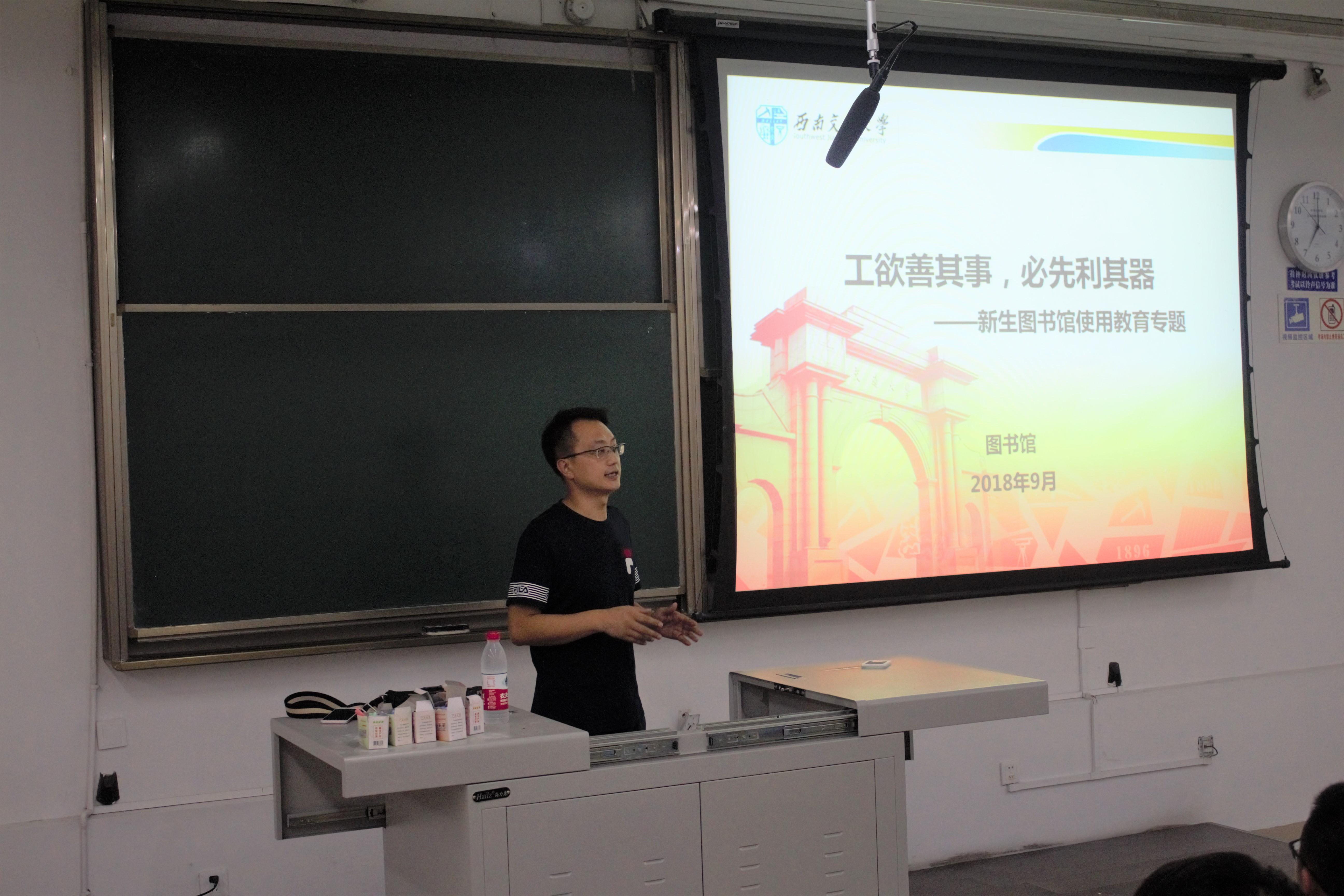 图书馆主讲人都兴宇老师分别从三个方面向本科新生讲述现今图书馆的概况。“工欲善其事,必先利其器”是本次图书馆入馆教育的专题。一个事情想要做好,必然要有好用的物器从外帮助,旨在告诉新生要好好利用图书馆的一切资源。紧接着,都老师引用了哈佛校长的观点,“人与自然的和谐统一”,要求新生好好认识和了解图书馆。犀浦校区的图书馆为大家提供了学习、研究和娱乐的物理空间,是集文化、交流、学习中心和育人中心于一体的现代化新型图书馆。随后,都老师向大家介绍了开云图书馆的悠久历史,引出一系列图书馆搬迁和修缮的历史,启发新生珍惜现在的图书馆资源。