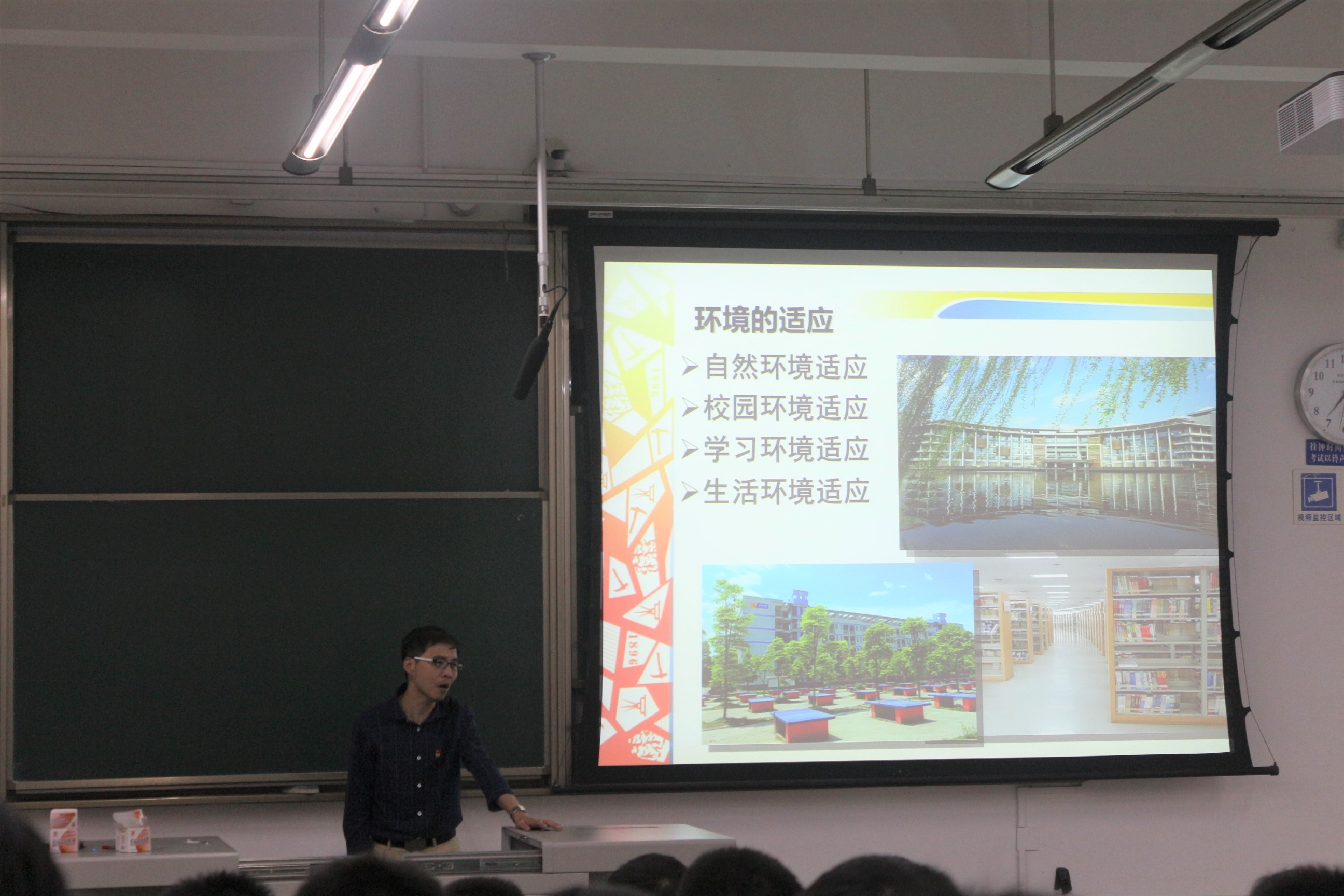 首先,杨育鸿老师给大家举出了新生入学时会遇到的主要问题并举例说明如何从容应对。杨育鸿老师强调最重要的是需要保持一颗好奇心和上进心,多判断、多尝试,才可能会有独特并新颖的看法和理解。接着,杨育鸿老师指出新生需要分别对环境、学习、人际关系和角色进行不同程度的适应,并从各个方面提供给新生一些有效的方法。他讲到,每个人需要正确认识自己,认识自己的外形和性格以便更好适应环境。紧接着,面对新生如何能更好地在大学生活的问题,杨育鸿老师分享了可以使得大家的工作生活事半功倍的小窍门,同学们纷纷表示很有意义。最后一个模块,杨育鸿老师给大家推荐了几本心理方面的书籍,并鼓励大家多和他人交流,保持开朗活泼。