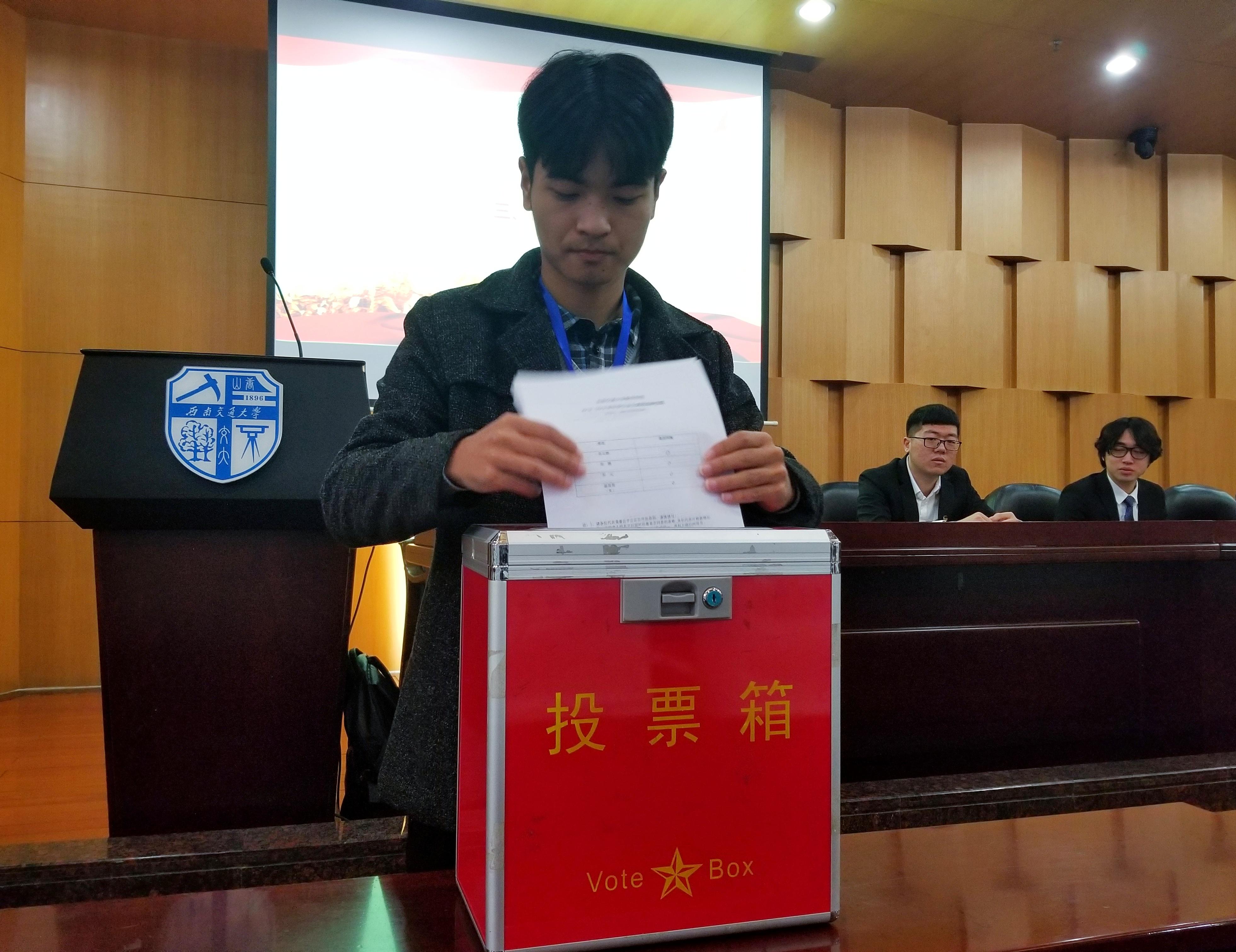 接着是大会的第二次全体会议,学生代表审议了学生会主席团的选举方法,并采用该方法对于新一届学生会主席团成员进行了选举,与会代表行使了自己的民主权力,投出了庄严的一票。