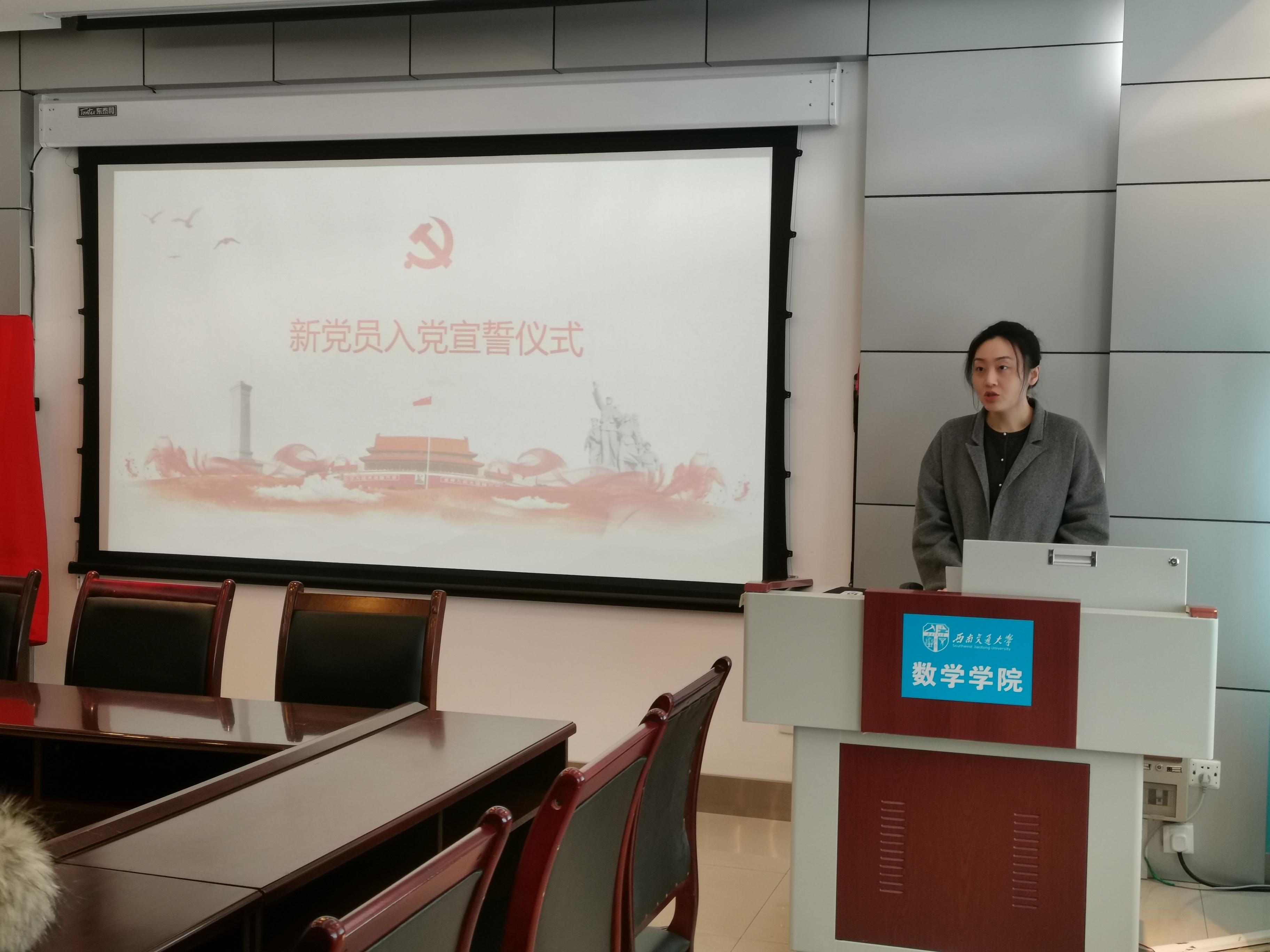 大会伊始,卢怡帆老师为大家宣读了13名新党员的名单。接着,卢怡帆老师带领着与会的所有人员进行宣誓。领誓人卢怡帆老师宣读入党誓词:“我志愿加入中国共产党,拥护党的纲领,遵守党的章程,履行党员义务,执行党的决定,严守党的纪律,保守党的秘密,对党忠诚,积极工作,为共产主义奋斗终身,随时准备为党和人民牺牲一切,永不叛党。”全体人员神情严肃庄重,面向党旗,右手握拳举起,跟读誓词。