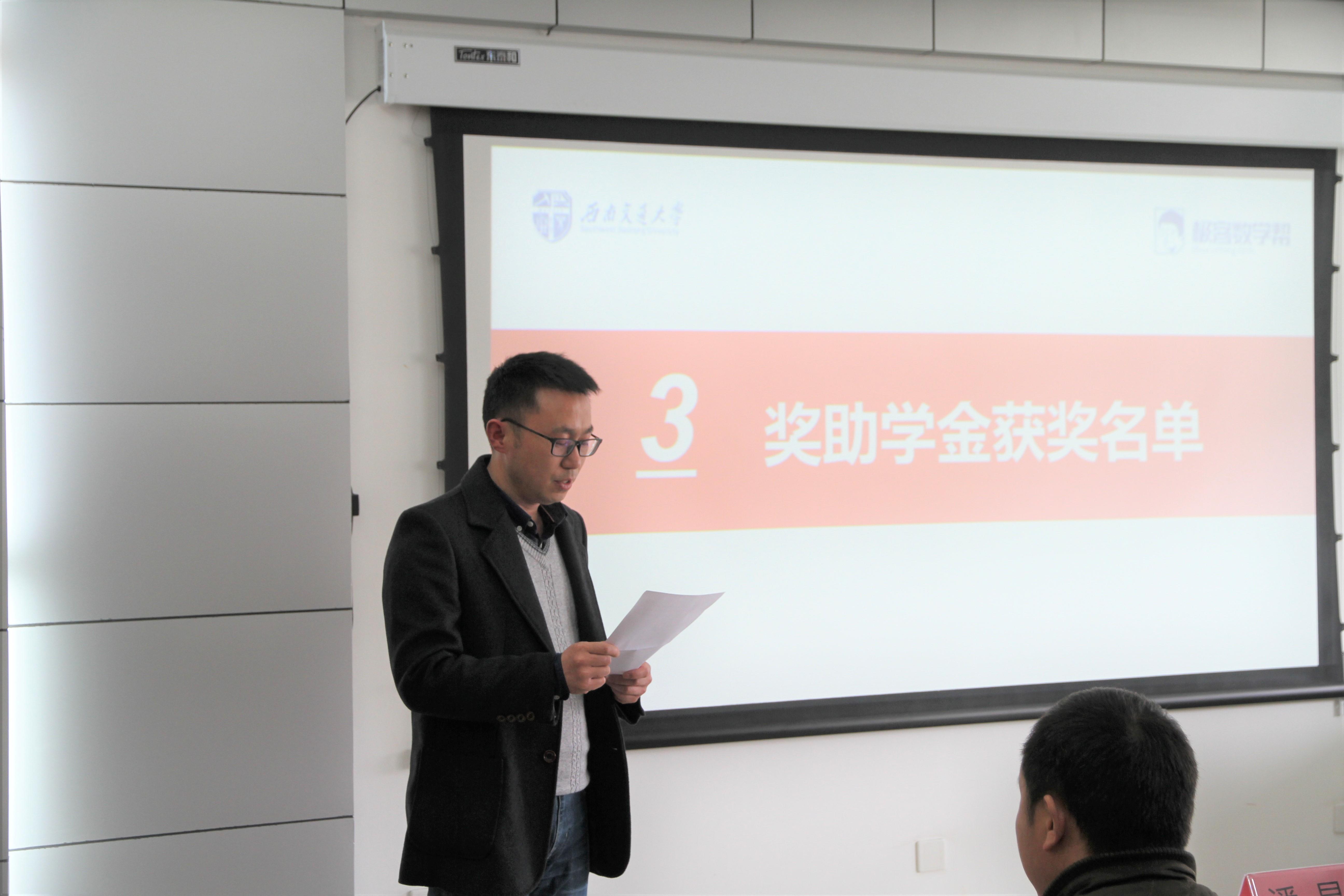 活动伊始,主持人杨育鸿副书记介绍了到场领导来宾,紧接着,杨书记邀请吴小平总经理和潘昱副处长带领助奖学金获得者前去科创工作室进行揭牌仪式。之后,潘小东副院长宣读了kaiyun开云官方网站2017—2018学年“极客数学帮奖助学金”获奖名单并简单介绍了该奖学金评选的流程,继而由赵晓东总监和杨晗常务副院长为获得该奖助学金的同学们颁奖。