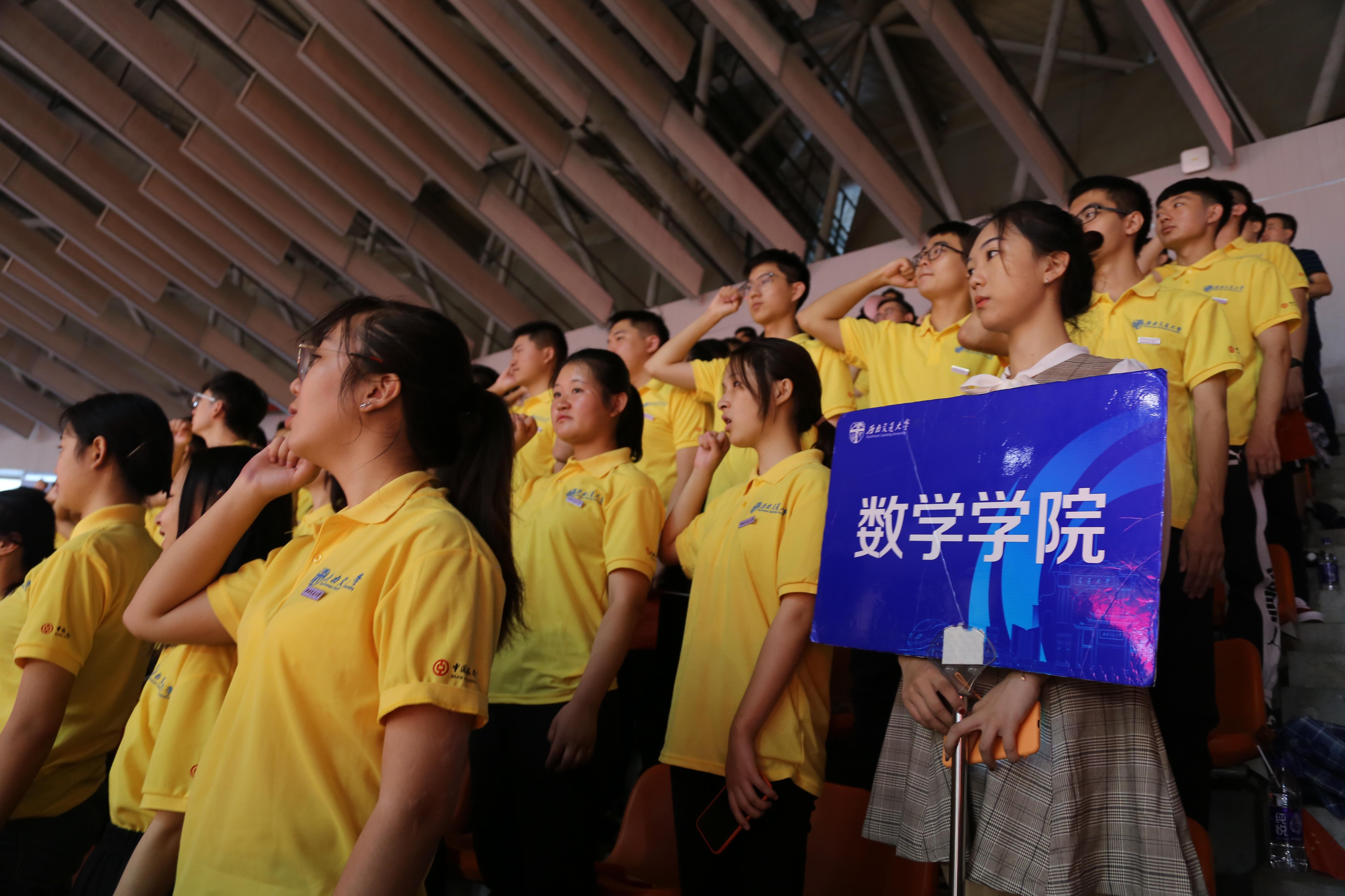 现场播放了两段精心制作的小视频,表现了学校对于新生工作的积极准备和对新同学到来的热烈欢迎。主持人一一介绍现场来宾,各个学院相继喊出口号。kaiyun开云官方网站学子精神饱满,意气风发,“百年交大,金牌数学”的口号响彻会场。2019级新生开学典礼正式开始,全体人员面向国旗奏唱国歌,严肃恢弘,气势磅礴。