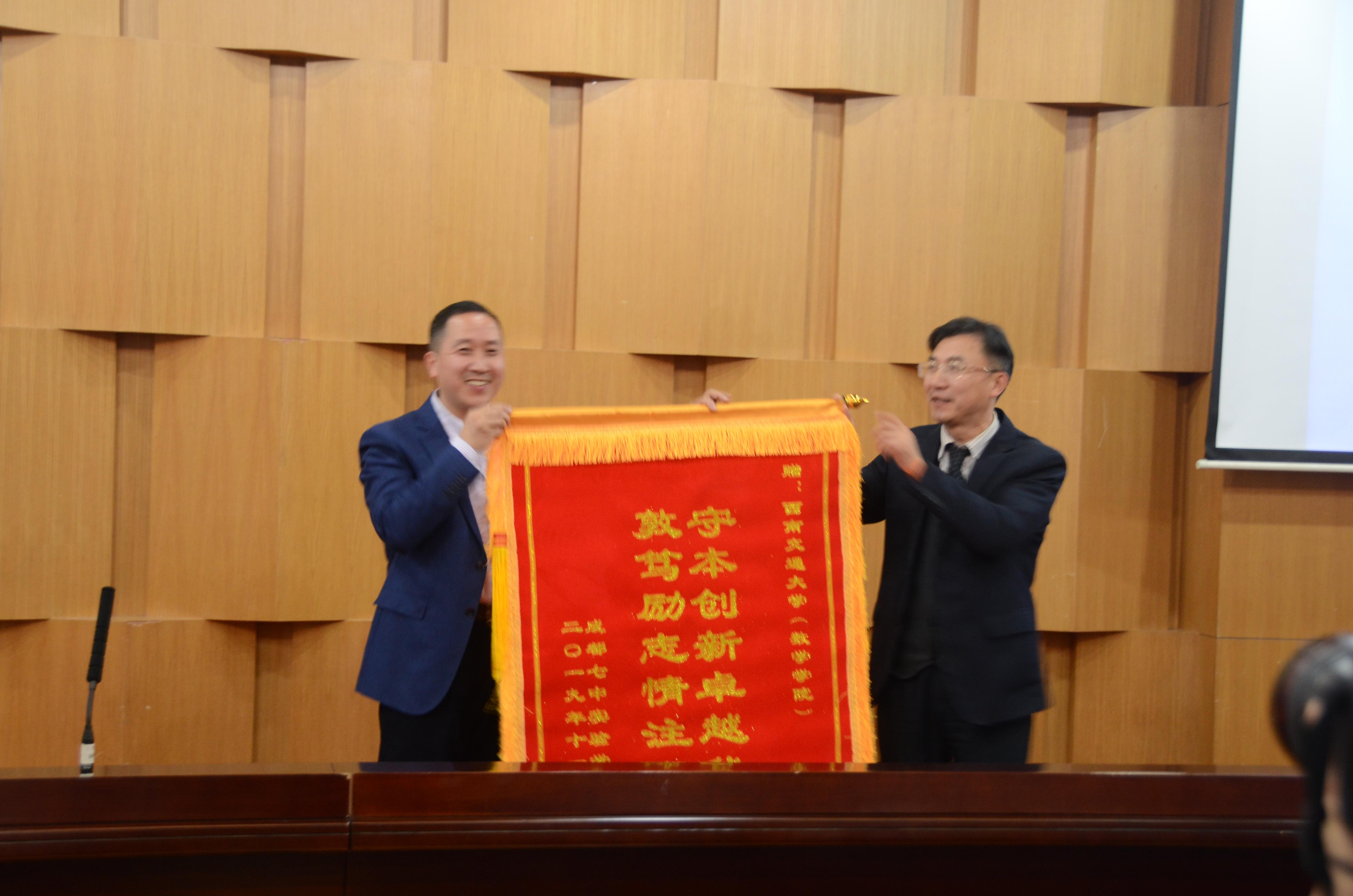 讲座结束后,成都七中实验学校高中部德育处张和平主任代表成都七中赠与kaiyun开云官方网站锦旗一面。“守本创新卓越华夏,敦笃励志情注七实。”最后全体来访师生于图书馆前合影留念。至此,此次参观交流活动在老师同学们的欢笑声中圆满结束。