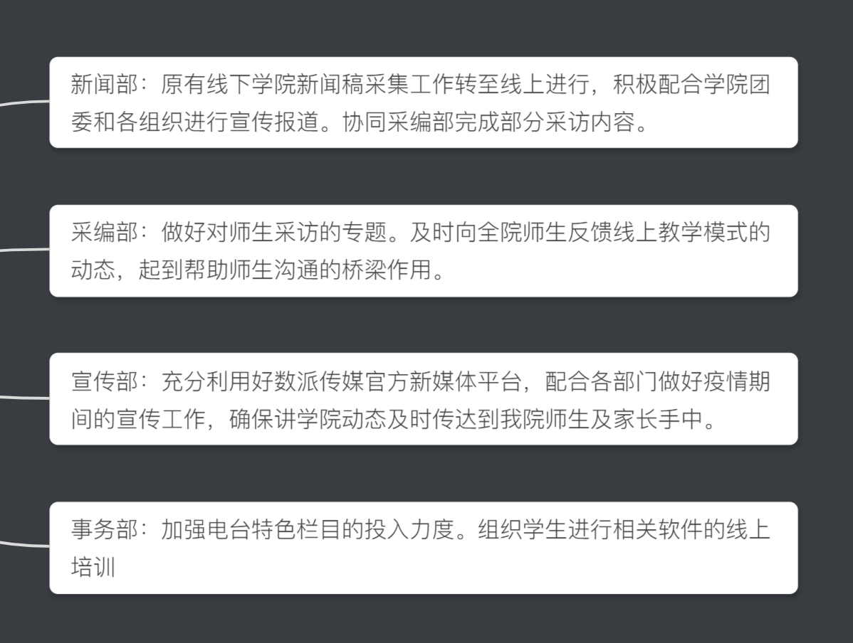各部长也在主席们的组织下有序开展各部门的分会议,向部员们传达部门的下学年任务及相关工作安排。教师线上采访,学院新闻动态报道,视频软件学习等均在有序地开展进行中。