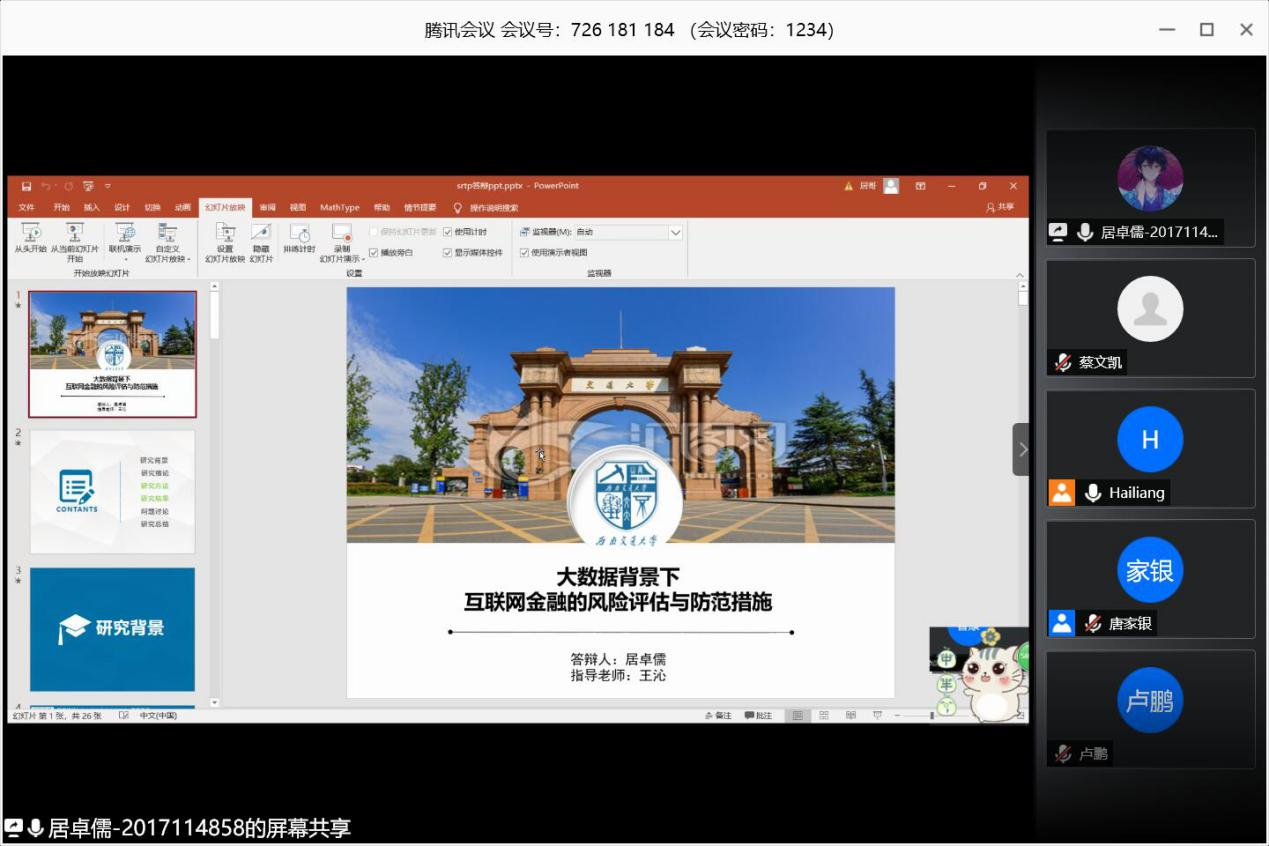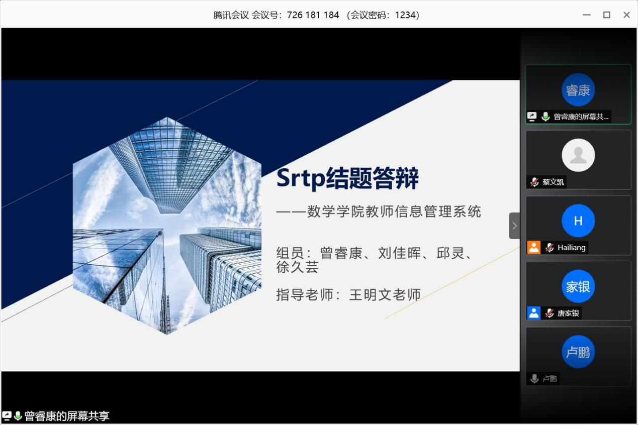 5月13日下午2点,kaiyun开云官方网站2019年度大学生科研训练项目(SRTP)结题验收答辩会于线上准时进行。此次答辩会的结题检查领导小组由王璐老师担任组长,潘小东老师担任副组长,赵海良、唐家银、刘品、梁涛老师等作为组员。全体参会人员准时进入会议参加答辩。