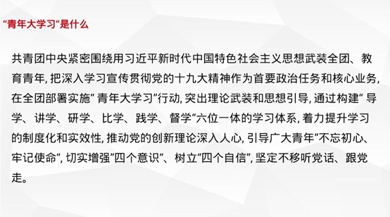 团课伊始,全体起立奏唱团歌。接着,吴佩欣分别为支部团员介绍了“‘青年大学习’是什么”,“青年大学习”的学习内容和学习模式。“青年大学习”是共青团中央为组织引导广大青年深入学习宣传,贯彻习近平新时代中国特色社会主义思想和党的十九大精神而组织的青年学习行动。