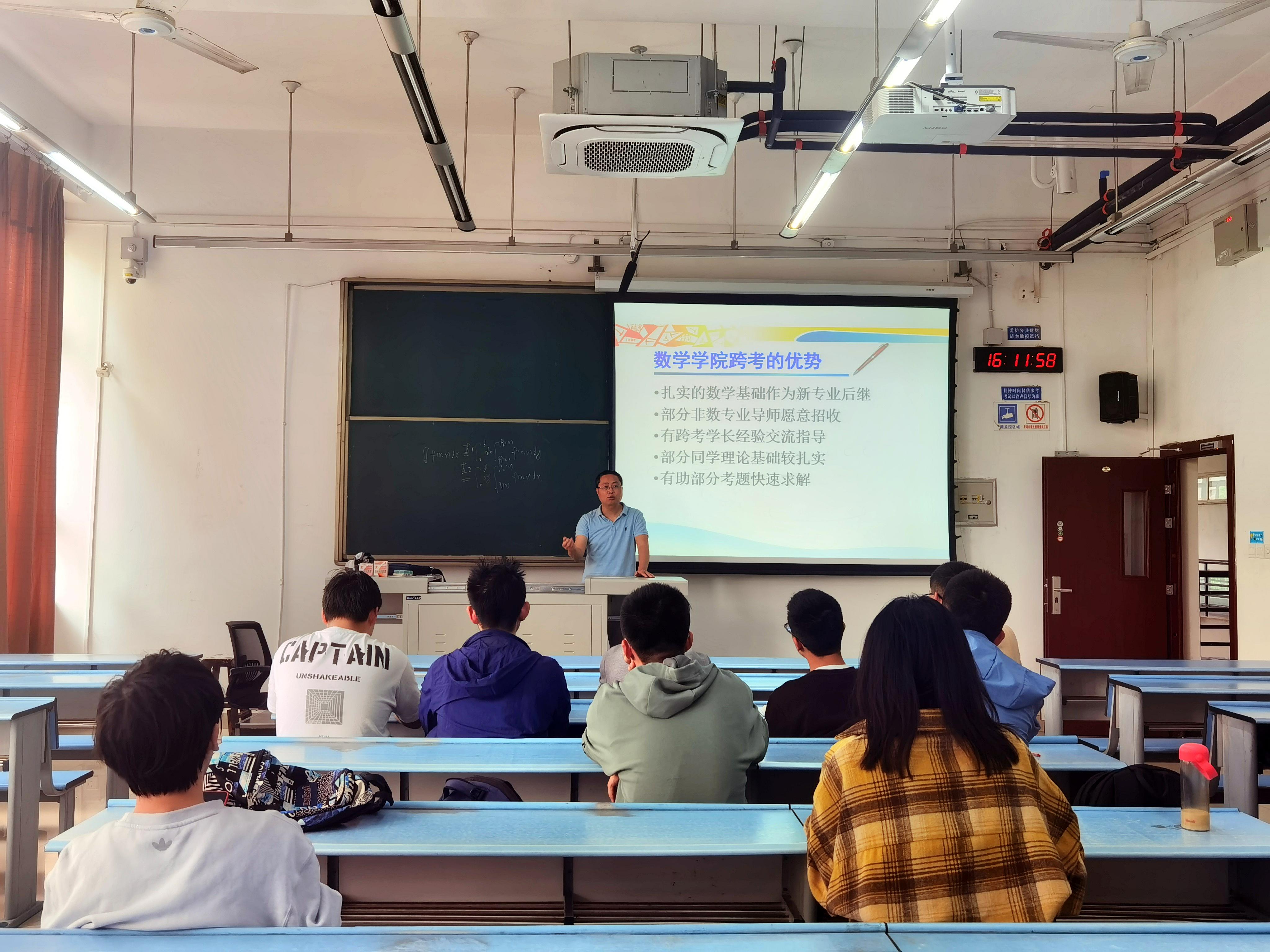 讲座开始,樊明书老师指出了数学专业与非数学专业的主要区别在于就业前景、个人兴趣爱好、读研的难易程度以及升学后就业的难易程度。他逐一分析了各个因素,为同学们考虑是否跨专业读研提供部分建议。紧接着,樊明书老师介绍了不同学校数学专业在研究生考试中所考查的内容,同时举例说明并建议同学们要找准目标制定相应计划。随后,樊明书老师分析了kaiyun开云官方网站的学生跨考非数学专业的优势和劣势,并着重强调虽然数学专业的学生有扎实的数学基础和理论基础,但是这容易使学生产生心理误区和复习资料选择误区,并可能会导致复习方式上出现错误。他建议同学们一定要客观进行选择,在复习时应多做多练,同时学会观察他人的错误并以此来进行自我检查,从而得到提升。之后,樊明书老师分别介绍了升学的三大途径,同时还鼓励各位同学以积极的心态学习数学。讲座最后为提问环节,同学们积极地向樊明书老师提出了各自的问题,老师也认真耐心地为同学们解答疑难,提出建议。