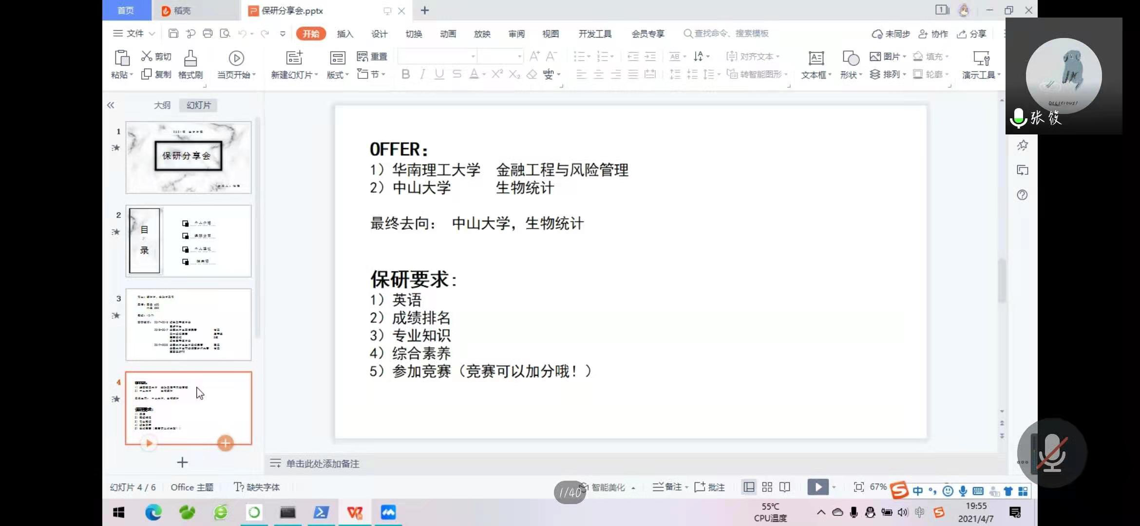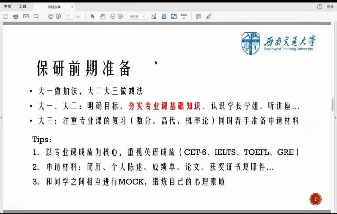 接下来带来分享的是保研至中山大学的张筱同学。首先她强调了保研最为重要的五个内容:成绩排名、英语能力、专业知识、综合素养和竞赛情况。接下来,她在保研的准备方面提出了自己的看法,她建议同学们确立清晰的目标,并做细致的学习规划,坚定自己的想法,同时平衡好娱乐和学习之间的关系,学会自我放松与调节。