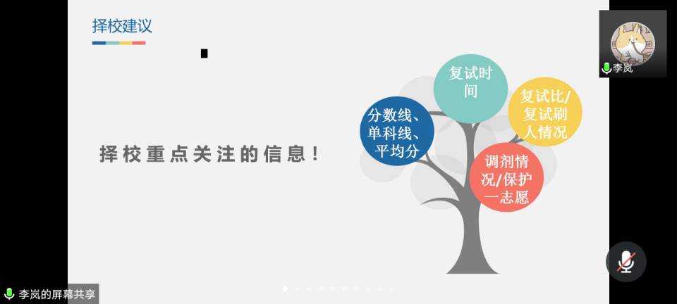 最后是由李湘江学长分享自己的保研过程,让大家对保研这个方式有更好的了解。保研分为两步,先是在自己的学校获得保研的资格以及获得目标院校的录取,李湘江学长就这两步都提出了详细的说明,帮助大家更好的知道保研的步骤与需求。除此之外,学长还讲述了一些关于跨专业保研和保外的相关知识,举出了一些自己知道的其他人的例子,向大家展示了其他的发展方向。