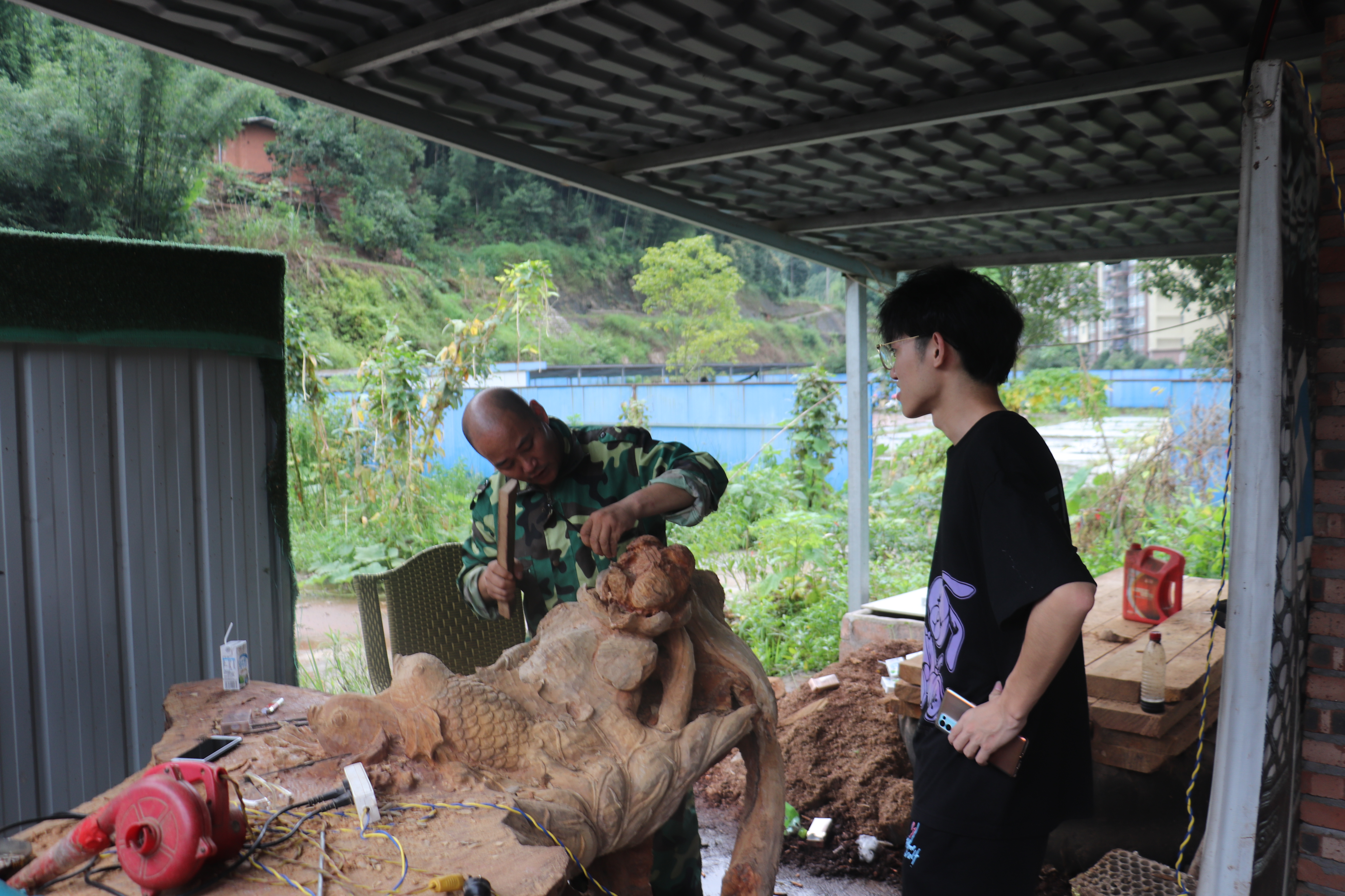团队还前往叙州区古柏镇宜宾奇异雕塑有限公司进行参观调研,并现场观摩根雕制作的全过程。据了解,为我们展示根雕制作技艺的师傅从10岁起便开始接触根雕艺术创作,距今已有30余年。师傅热情地向团队成员展示了根雕的雕刻加工过程,依次介绍了选材、创作、雕刻等步骤。交流过程中,提及工匠精神时,师傅说道:“工匠精神对于我而言,就是一辈子只做一件事,干一行,爱一行,精一行。”