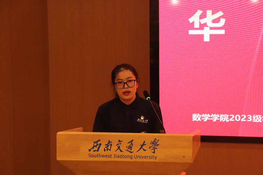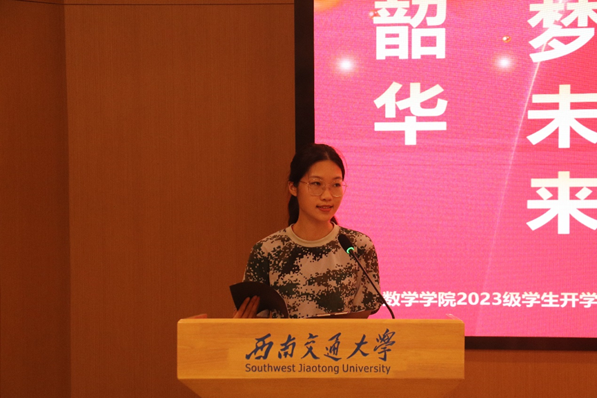 议程第三项,教师代表杨洋教授发言。杨教授介绍了学科的基本情况,为新生们分享了自己的求学历程与成长感悟,强调了热爱数学的重要性,嘱托新生们牢记自己的使命、牢记父母的重托、牢记老师的期盼,学会自觉、学会选择、学会脚踏实地,为提高自身的生命价值和终身的全面发展奠定坚实的基础。